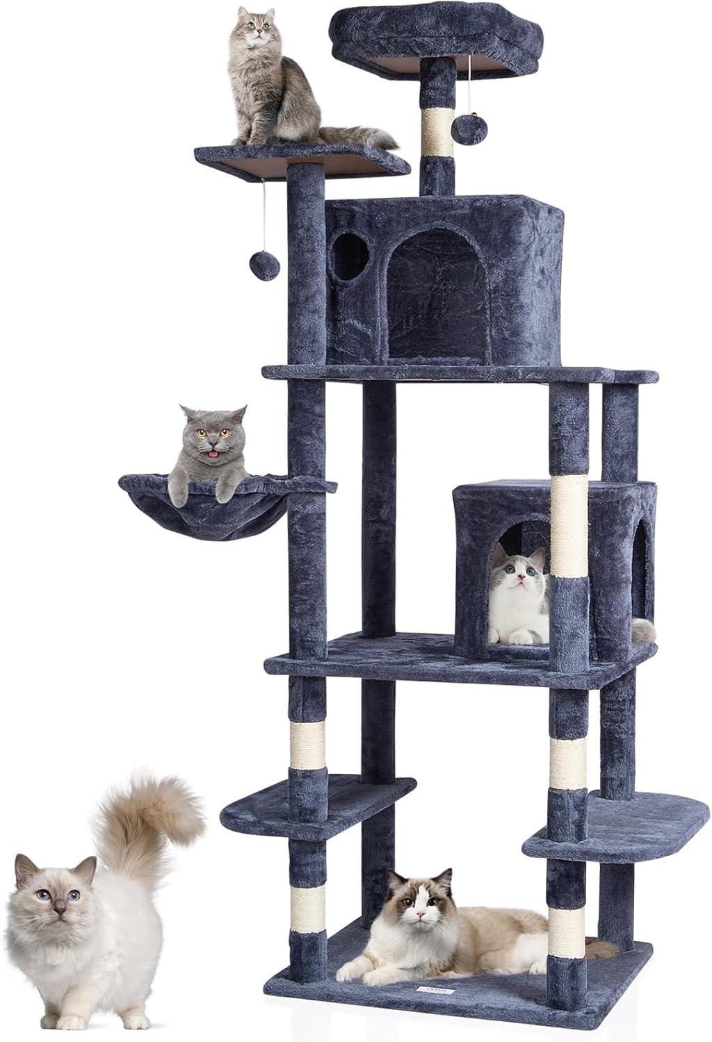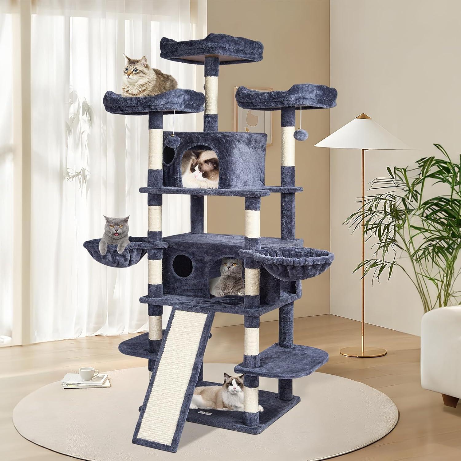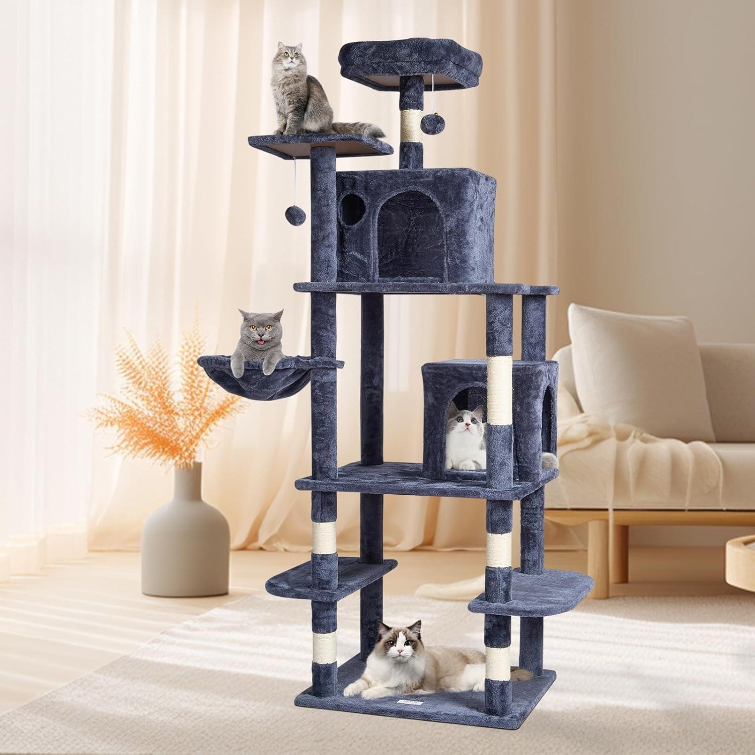 Cats' Cozy Haven: The cat tower features a spacious cat condo, top perch, and hammock, providing a private and secure resting environment. There are multiple platforms for cats to freely choose where to play and rest. Soft plush surfaces are gentle on cats' skin and claws, ensuring a comfortable lounging experience.