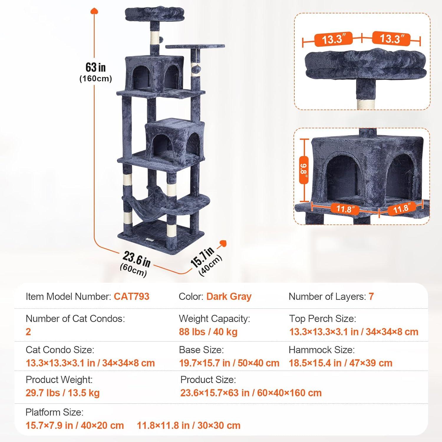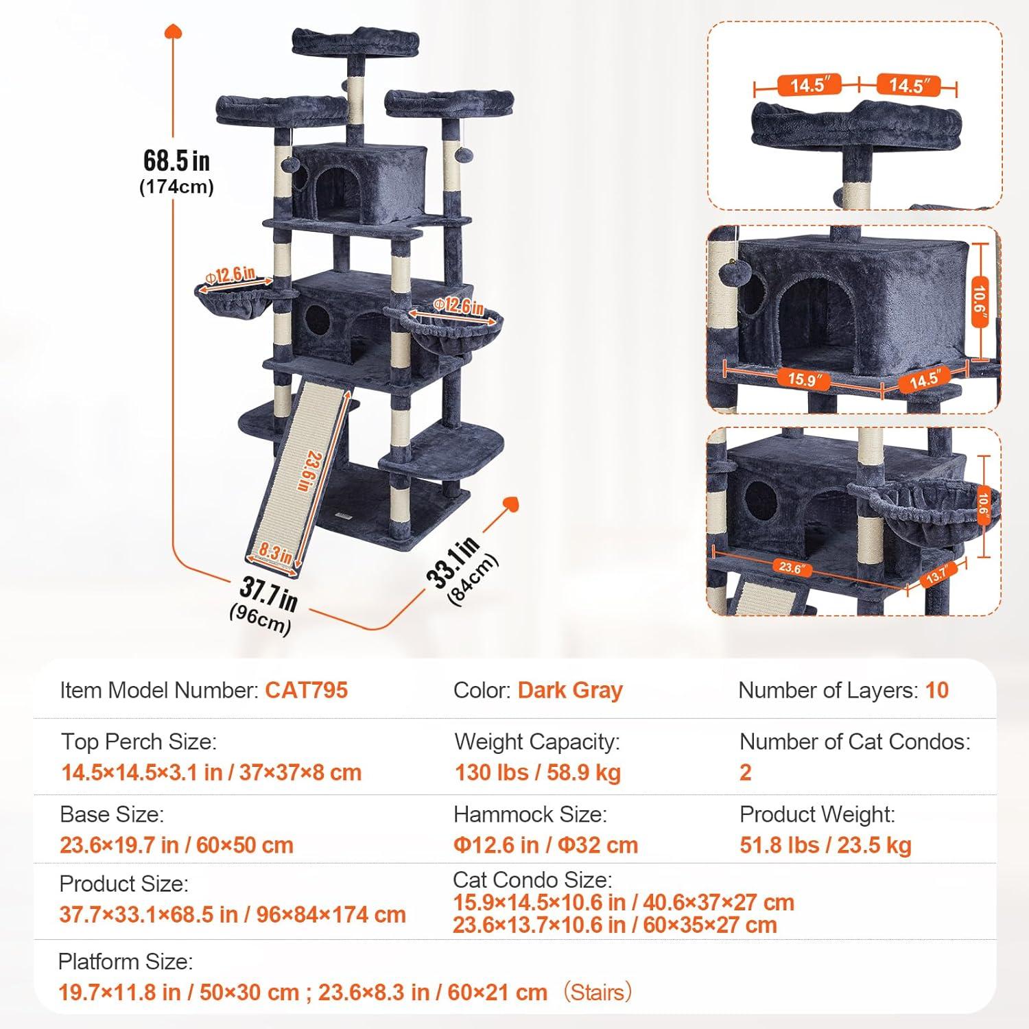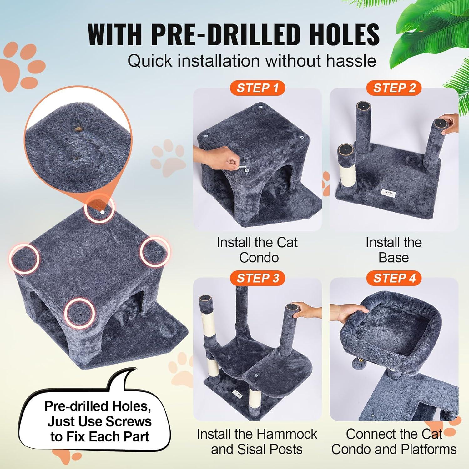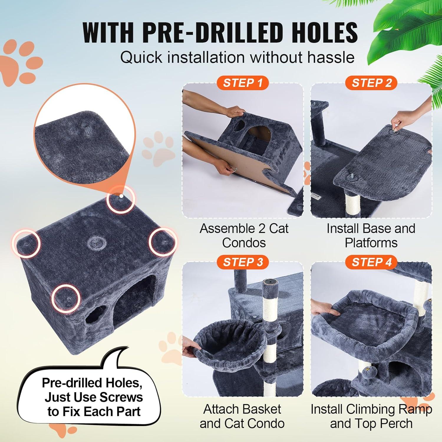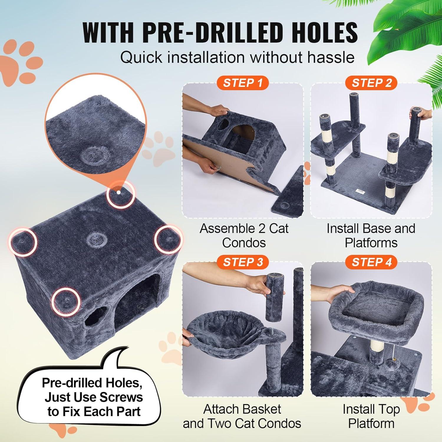Easy Installation: Pre-drilled holes make installation effortless. Our cat tree for indoor cats comes with detailed assembly instructions and all necessary screws, bolts, wrench, and expansion screw kits. Even first-time users of pet furniture can easily complete the setup, saving time and effort.