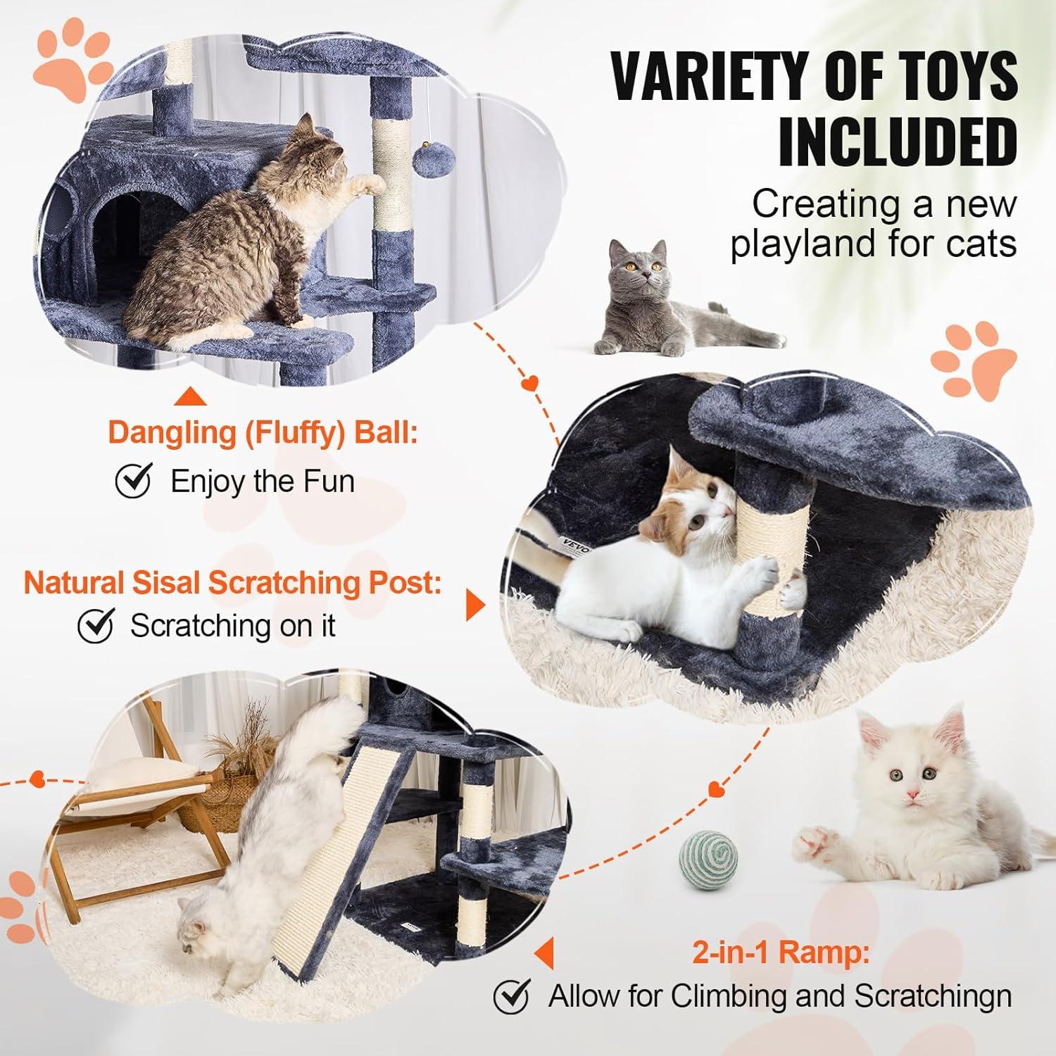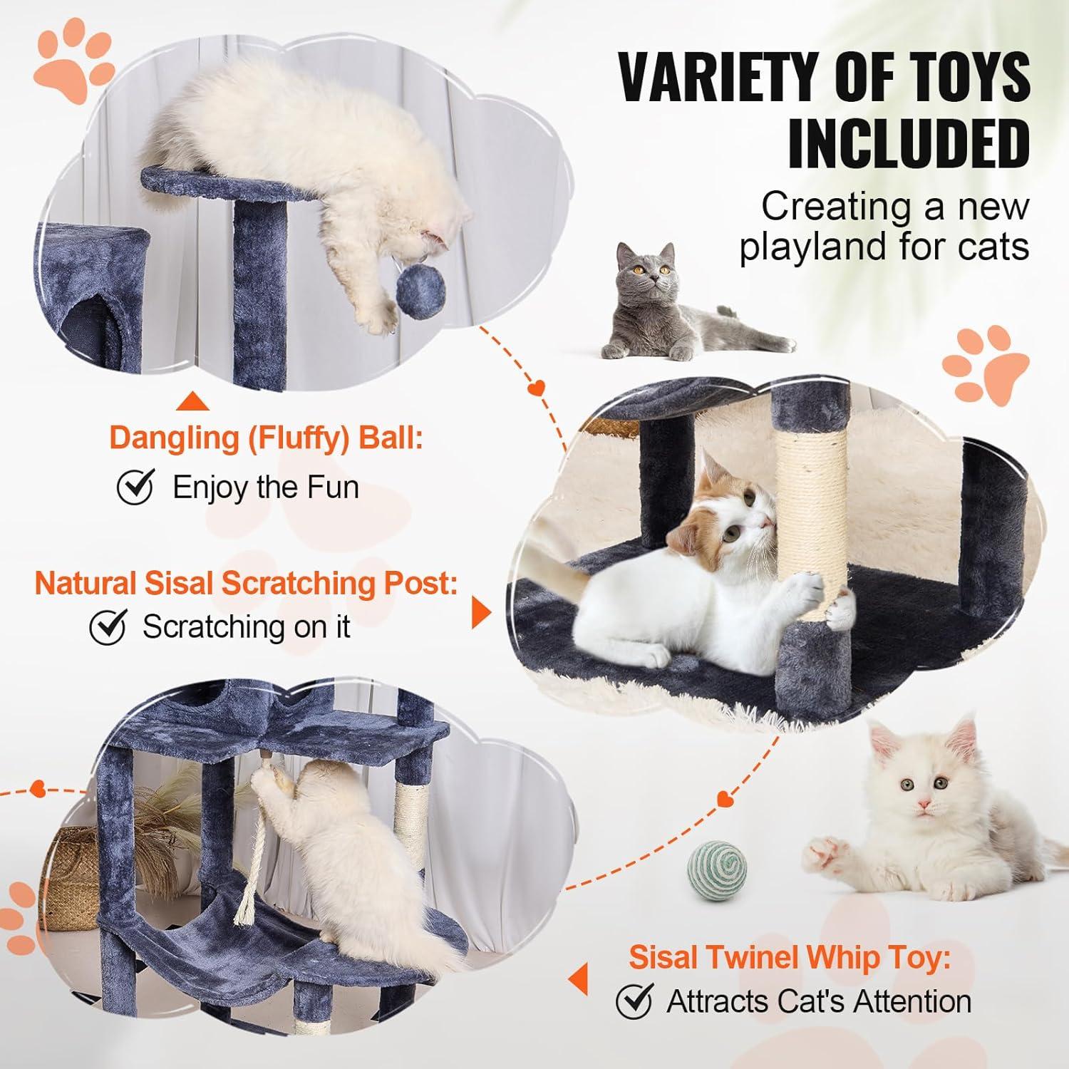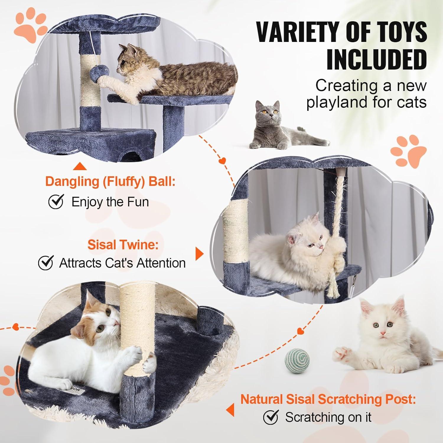 Joyful Playtime for Cats: Hanging ball toys and spring balls on the cat scratching tree attract cats' attention, stimulating their playfulness. Sisal-wrapped scratching posts allow cats to stretch and exercise, keeping them active, relieving boredom and stress, and preventing furniture damage.