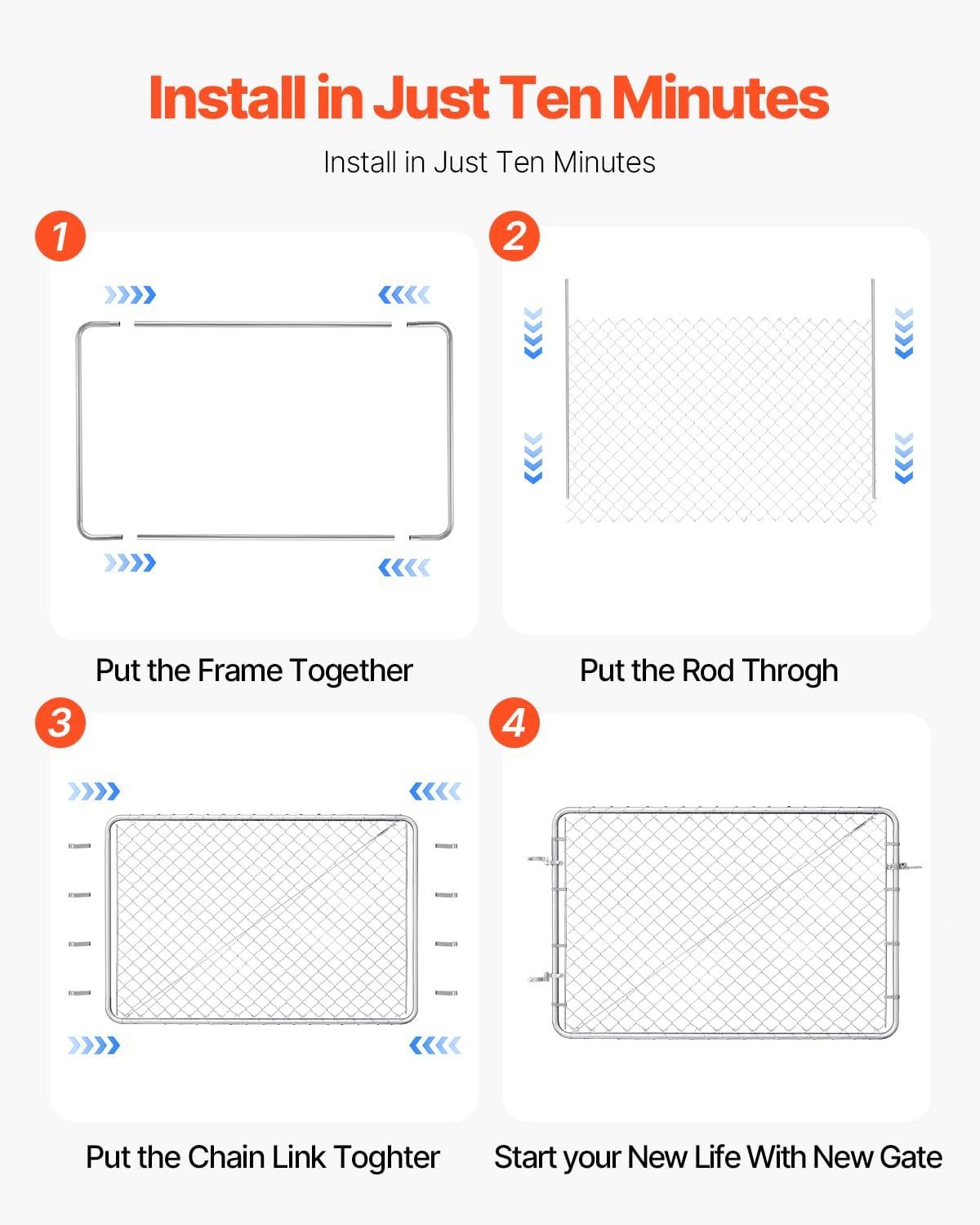 imageVEVOR Chain Link Fence Gate 72 x 48 in Adjustable Chain Link Fence Panel Fit 226 ft W x 6 ft H Garden Fence Gate Opening Fencing Gate with Plastic Coating for Farm Black Posts Not IncludedSilver
