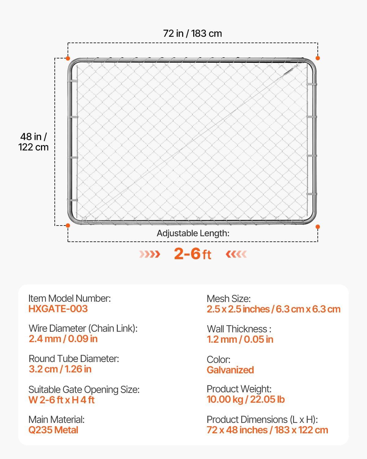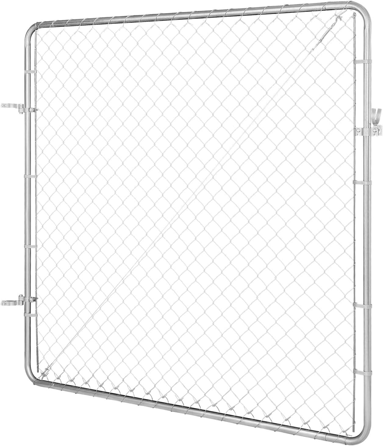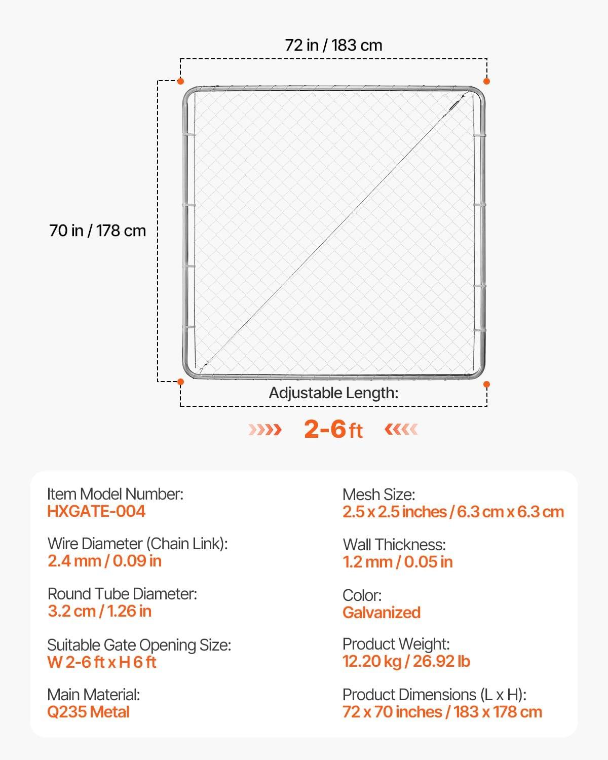 VEVOR Chain Link Fence Gate, 72 x 48 in, Adjustable Chain Link Fence Panel, Fit 2.2-6 ft (W) x 6 ft (H) Garden Fence Gate Opening, Fencing Gate with Plastic Coating, for Farm Black, Posts Not Included(Silver)