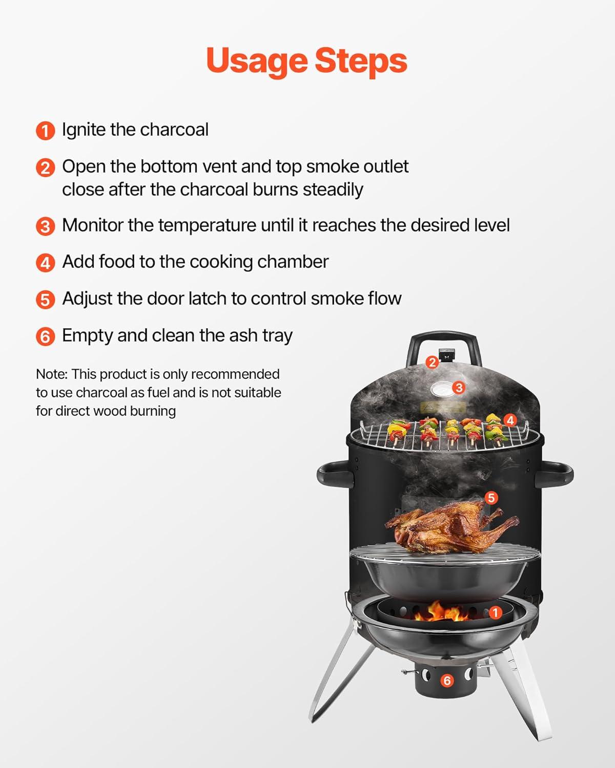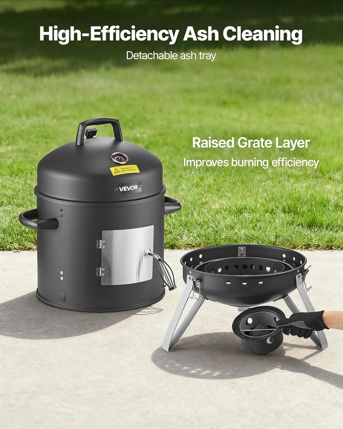 Versatile Use: VEVOR 16-inch diameter charcoal smoker comes with 2 large cooking grates – with the lid open, it can serve as a grill for direct heat cooking, while closing the lid transforms it into a smoker that infuses your food with rich, flavorful smoke