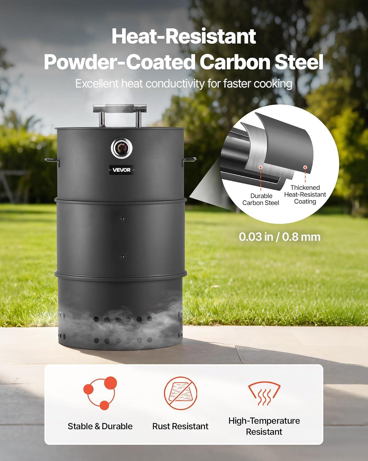 Durable & Sturdy: Built with heavy-duty coated steel, this BBQ smoker grill delivers lasting durability and shape retention. High-temperature powder coating resists heat, rust, peeling, and outdoor weather, making it a reliable partner for backyard barbecues