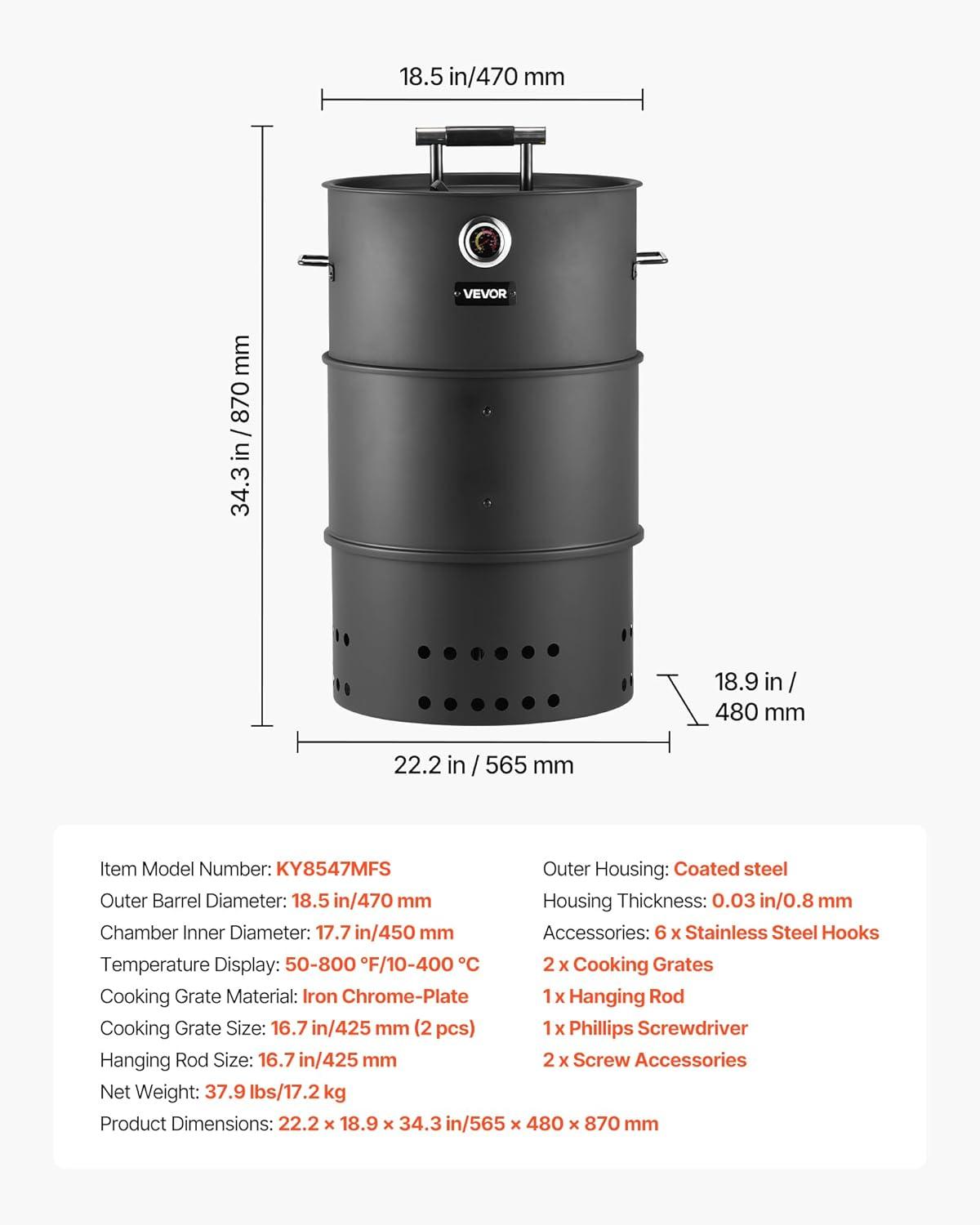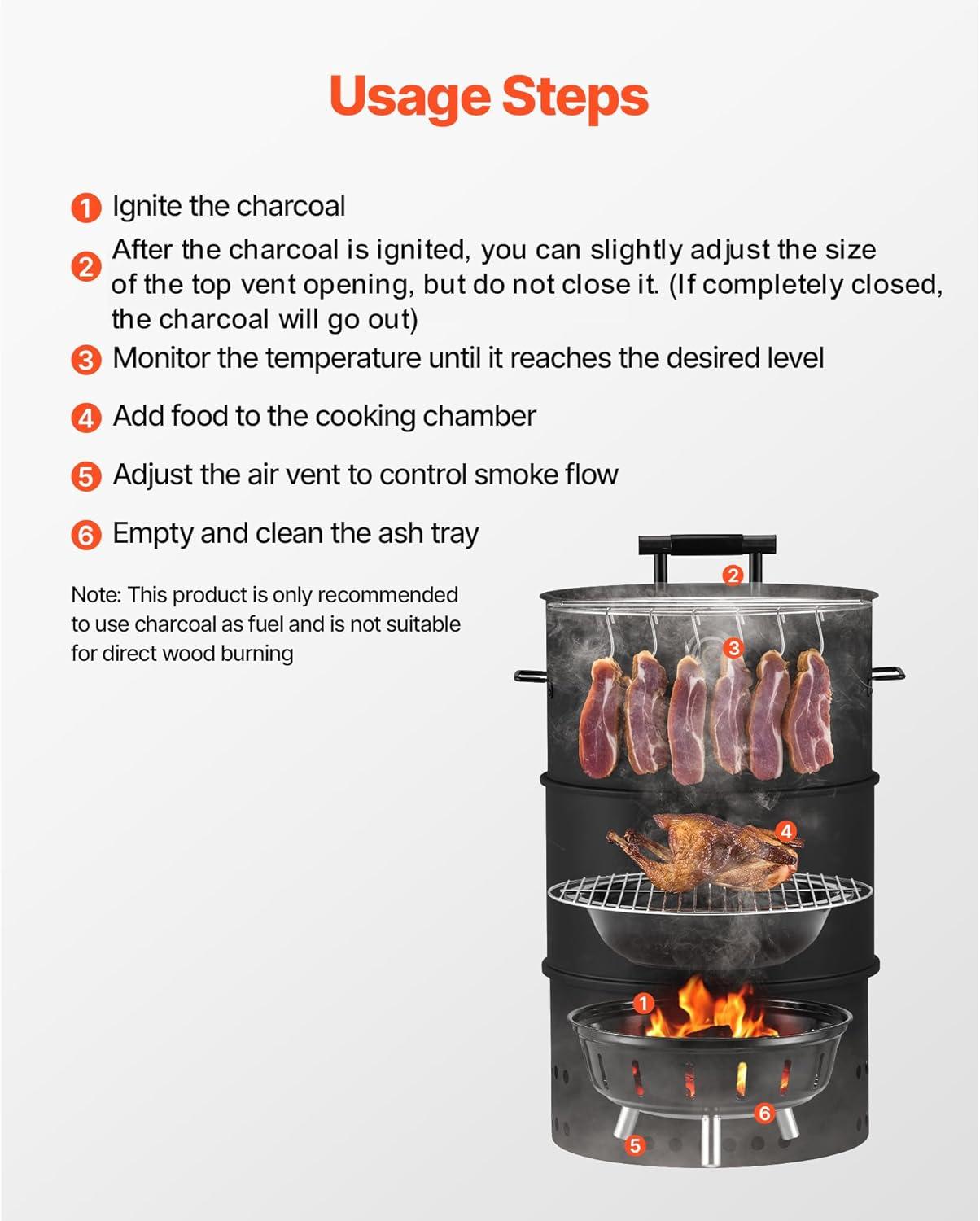 Versatile Use: VEVOR 16-inch diameter charcoal smoker comes with 2 large cooking grates – with the lid open, it can serve as a grill for direct heat cooking, while closing the lid transforms it into a smoker that infuses your food with rich, flavorful smoke