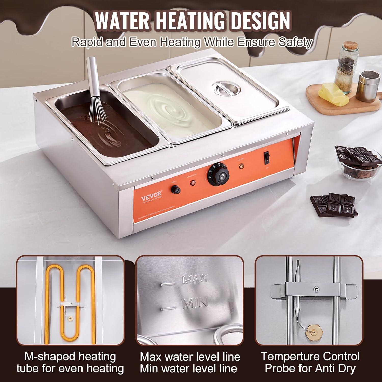 3 Large Capacity Cylinders: This stainless steel chocolate melter pot includes 3 independent cylinders. You can use one for melting chocolate and the other for melting milk or cream, which helps to improve efficiency in both work and daily life. Each pot has a capacity of 3.75 qt, serving a large number of people simultaneously.