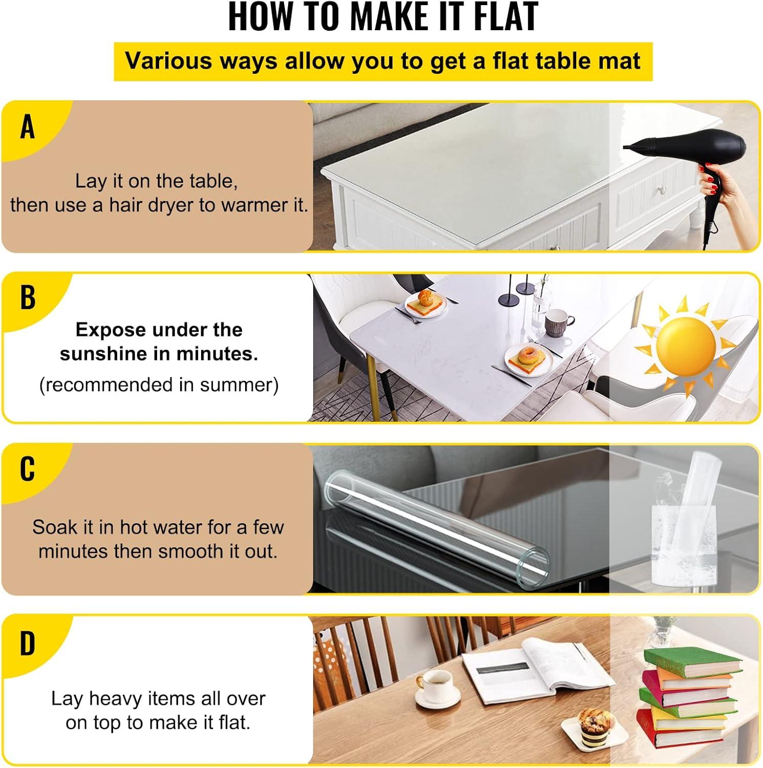 How to Get a Flat Cover: 1. Heat it with a hairdryer to make it flat. 2. Soak it in hot water for a few minutes to make it flat. 3. Expose under sunshine for a few hours to make it flat. 4. Lay the table protector in a reverse-roll direction and put heavy items on it to make it flat.