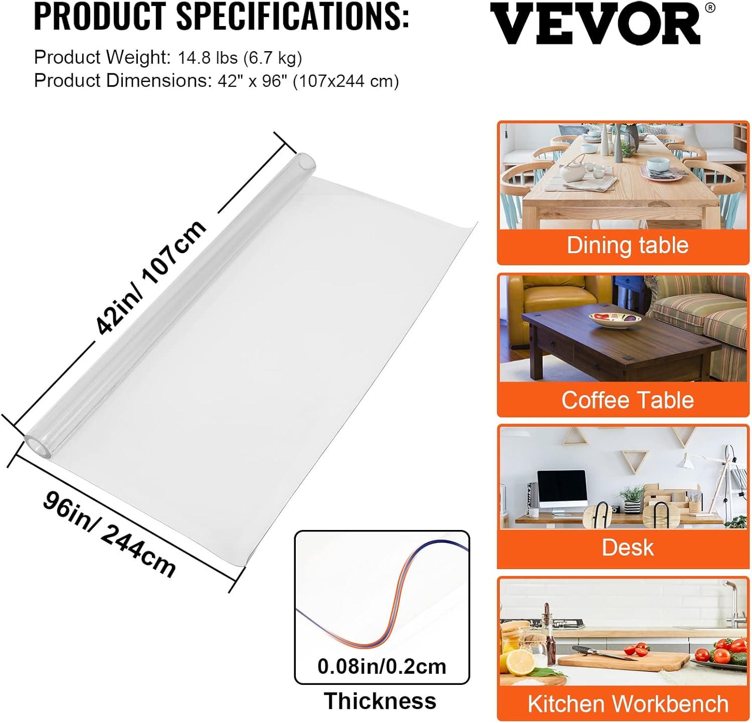 VEVOR Clear Table Cover Protector, 48 inch/1230 mm Round Table Cover, 1.5 mm Thick PVC Plastic Tablecloth, Waterproof Desktop Protector for Writing Desk, Coffee Table, Dining Room Table(42" x 96" (Rectangular))