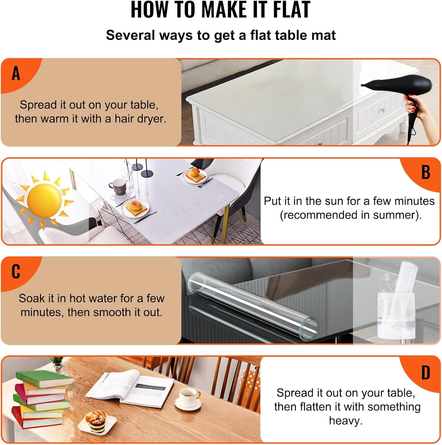 Easy to Use: Follow these simple steps to maximize the benefits of the plastic table cover: a. Open the package and wipe away any dust or debris with a damp cloth. b. Use a hair dryer on medium heat, held about 10 cm away from the mat's surface, to flatten it effectively. c. Ensure a wet desktop surface, then lay the mat flat. Use a plastic sheet to remove any air bubbles and achieve a snug and beautiful fit.