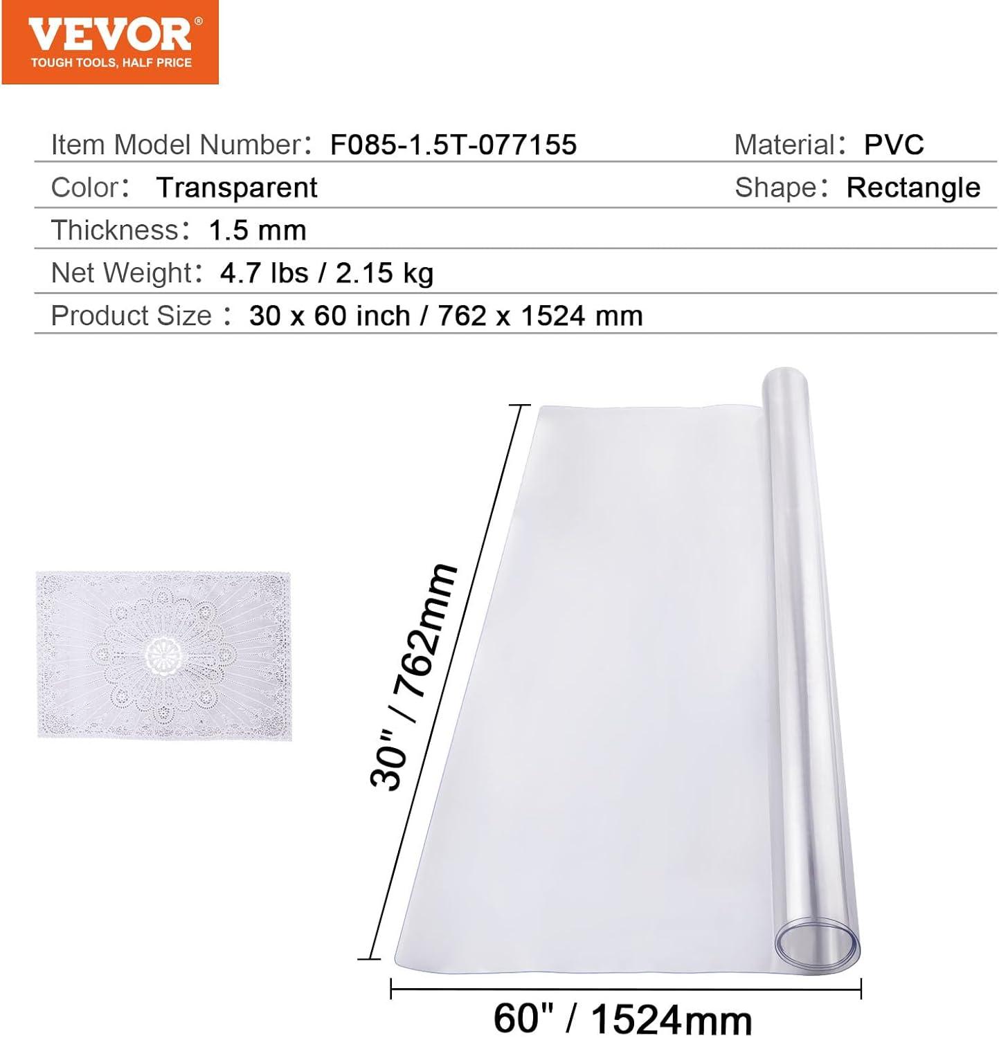 VEVOR Clear Table Cover Protector, 48 inch/1230 mm Round Table Cover, 1.5 mm Thick PVC Plastic Tablecloth, Waterproof Desktop Protector for Writing Desk, Coffee Table, Dining Room Table(60″ x 24″ (Rectangular))