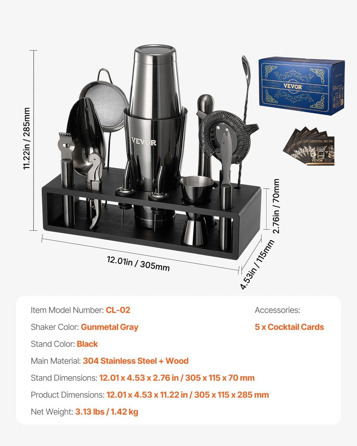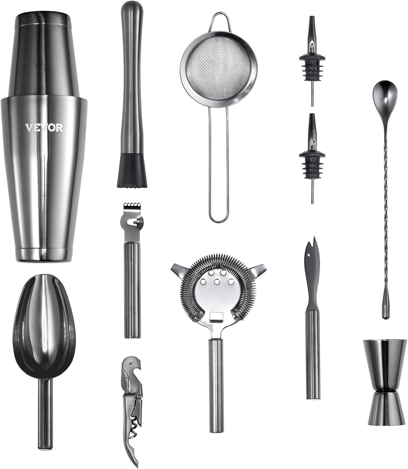 Complete Cocktail Shaker Set: The 13-piece comprehensive kit will meet all your professional bartending needs, including a boston shaker, mixer spoon, muddler, jigger, strainer, mesh strainer, two liquor pourers, ice scoop, lemon zester, corkscrew, cheese knife, and bamboo stand