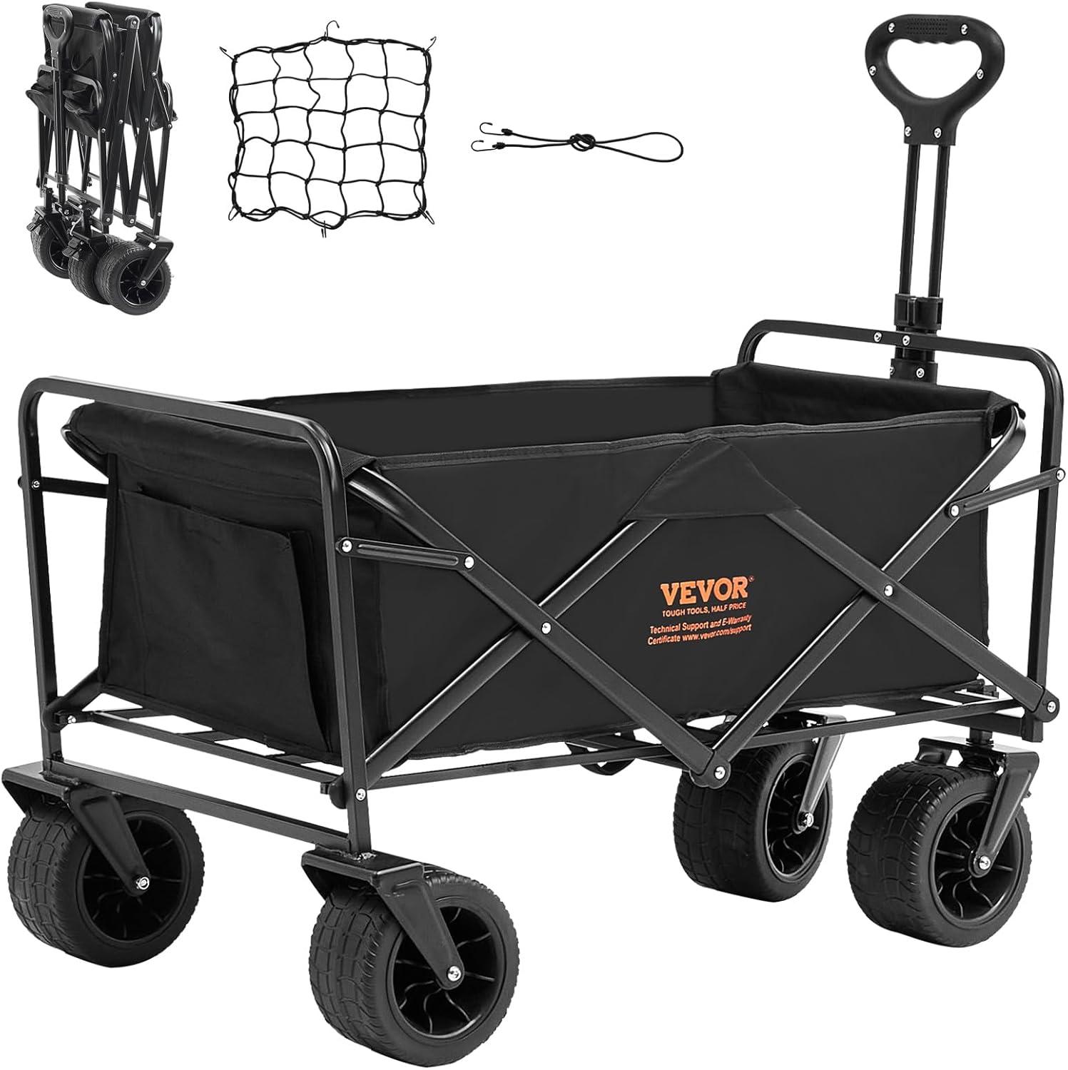 HEAVY DUTY & ROBUST STEEL FRAME: VEVOR collapsible wagon is made of upgraded and thickened steel tube. Crafted from high-strength iron with powder coating, this foldable wagon is corrosion-proof and durable.