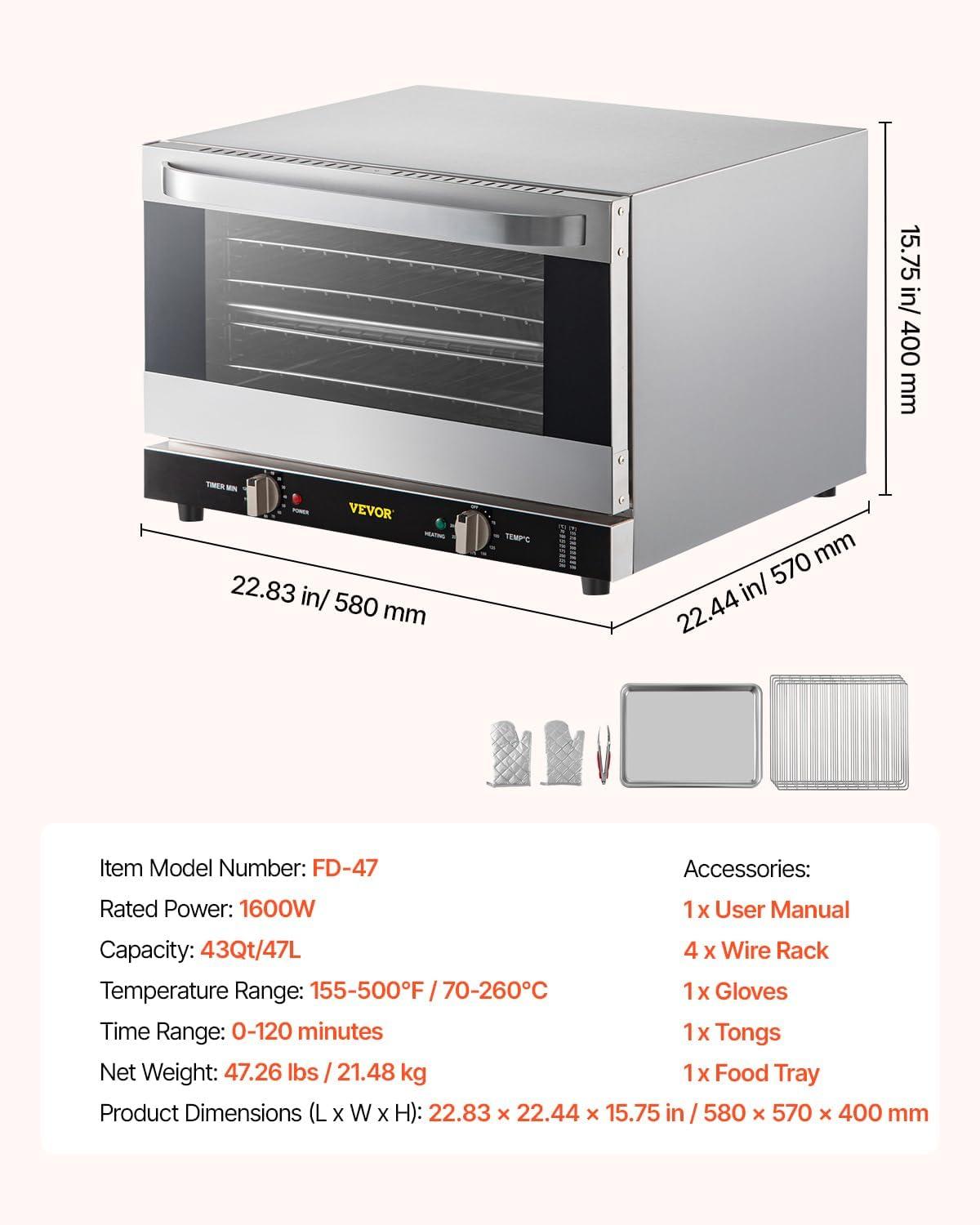 VEVOR Commercial Convection Oven, 4.24 cu.ft Conventional Countertop Oven for Full-Size Pans, Electric Convection Ovens with 4 Racks, 360° Hot Air Circulation, for Bakery, Restaurant & Pizza Shop(4-Tier 43Qt)