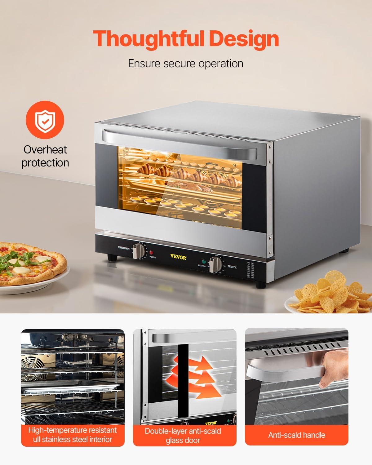 Premium Materials: Crafted from premium stainless steel, the convection oven is easy to clean and maintain. Its double-layer tempered glass helps reduce heat loss and the risk of burns while allowing you to monitor your food as it cooks