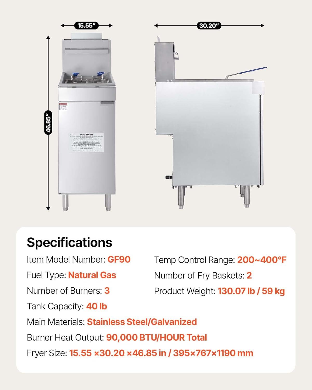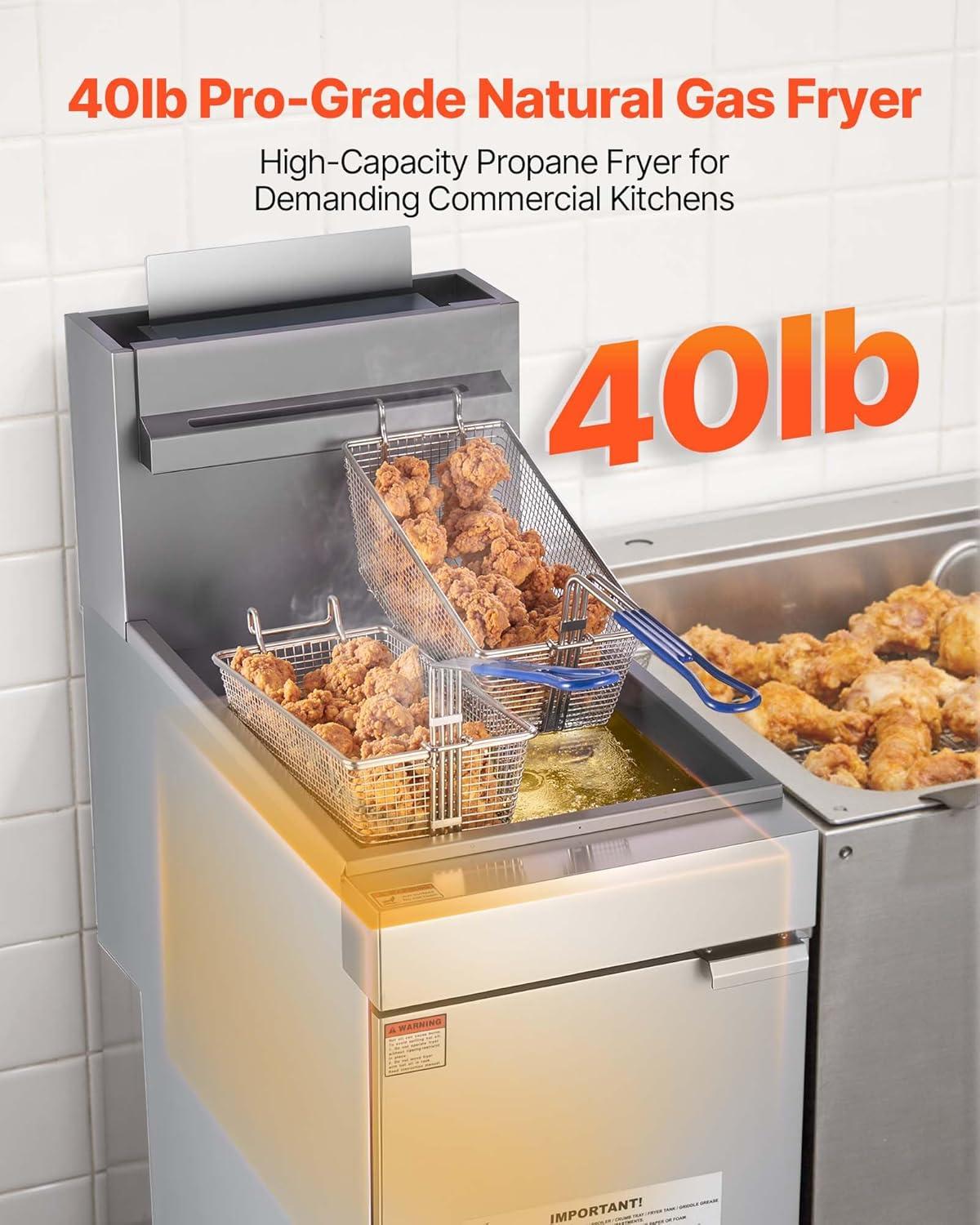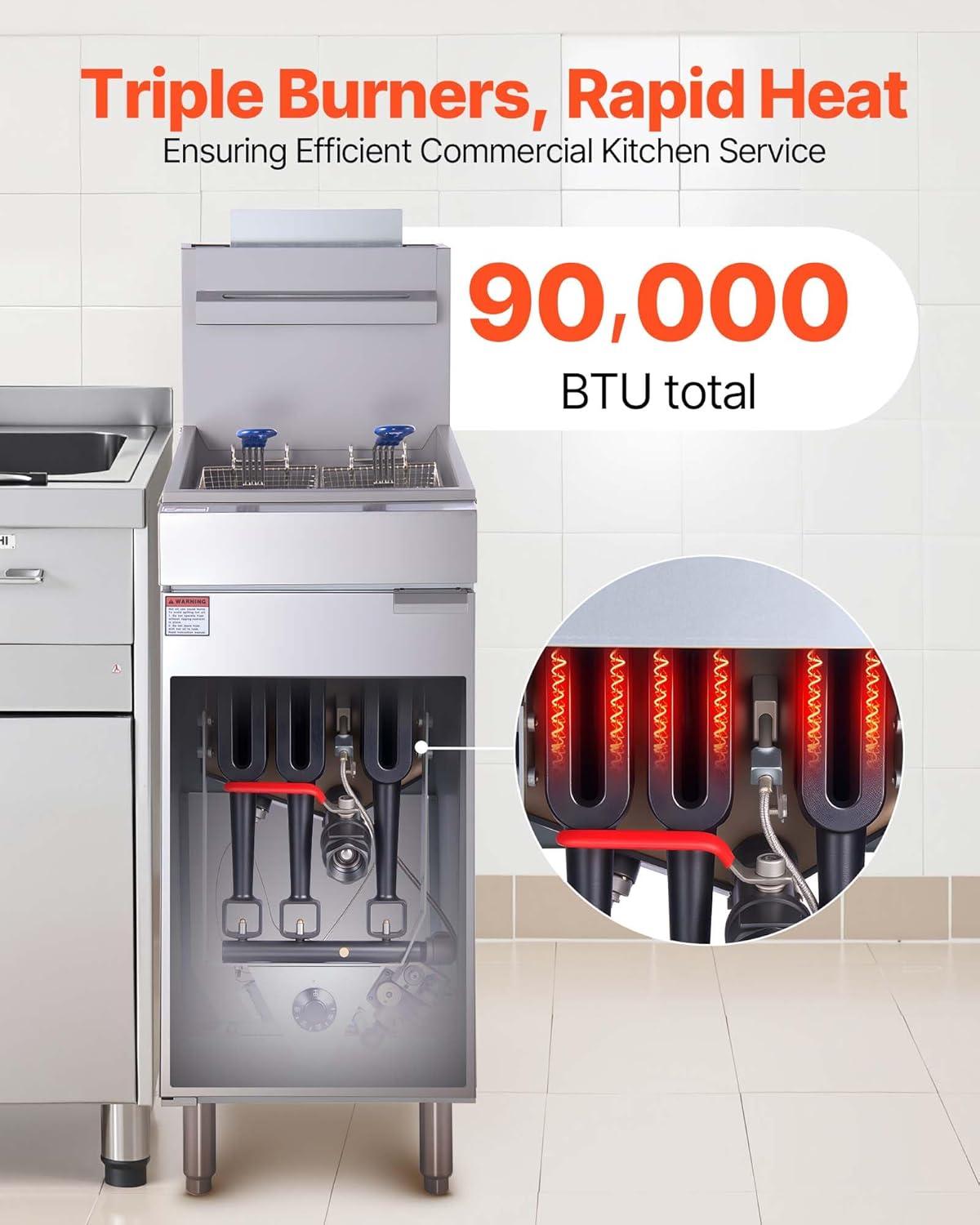 High-Capacity Rapid Heating: 40lb large capacity tank with 90,000BTU triple burners for rapid heat-up, the commercial deep gas fryer enables continuous batch frying of burgers, fries, chicken etc.—Ideal for commercial kitchens during peak hours