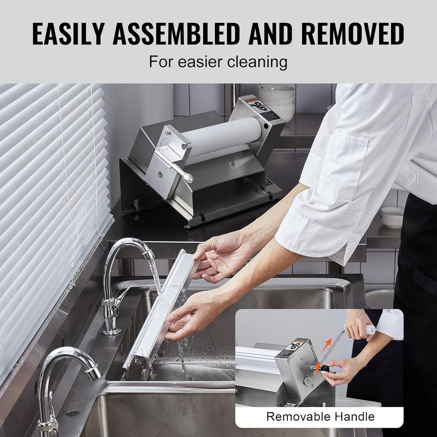 Efficient and Secure: Equipped with a high-quality, powerful motor, this dough sheeter quickly creates puff pastries and easily handles various culinary tasks. The thickened stainless steel construction ensures it maintains shape even after prolonged use. The protective mesh cover and large rubber feet design guarantee stability and secure during operation.