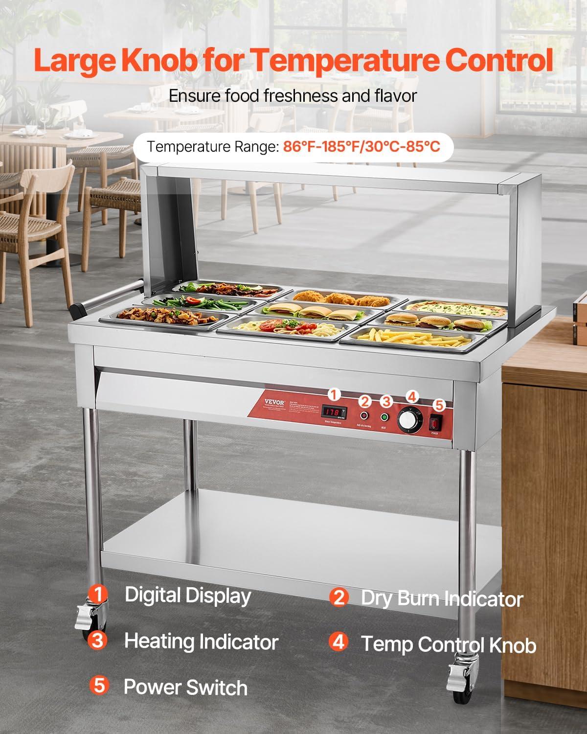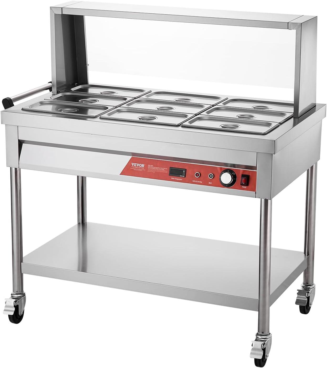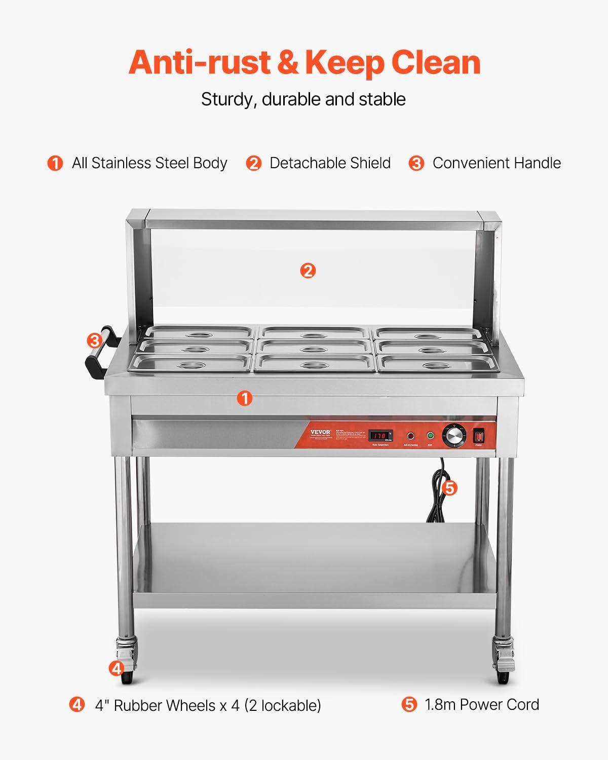 VEVOR Commercial Electric Food Warmer, 7 Pans + 2 Pots Steam Table, 1800W Professional Buffet Catering Food Warmer with Shield Undershelf Wheels, Stainless Steel Server for Party Restaurant(8 Pans + 2 Pots)