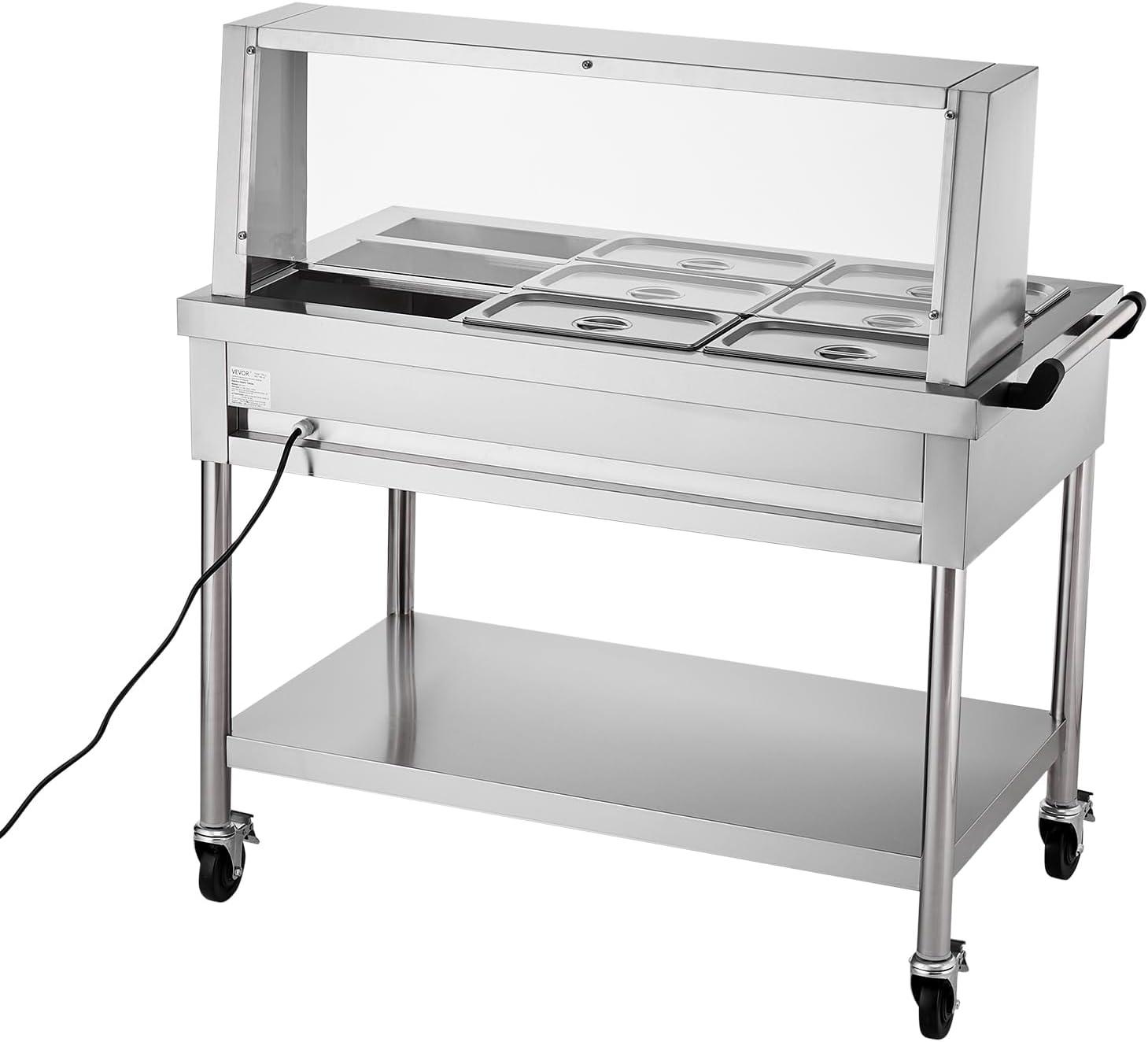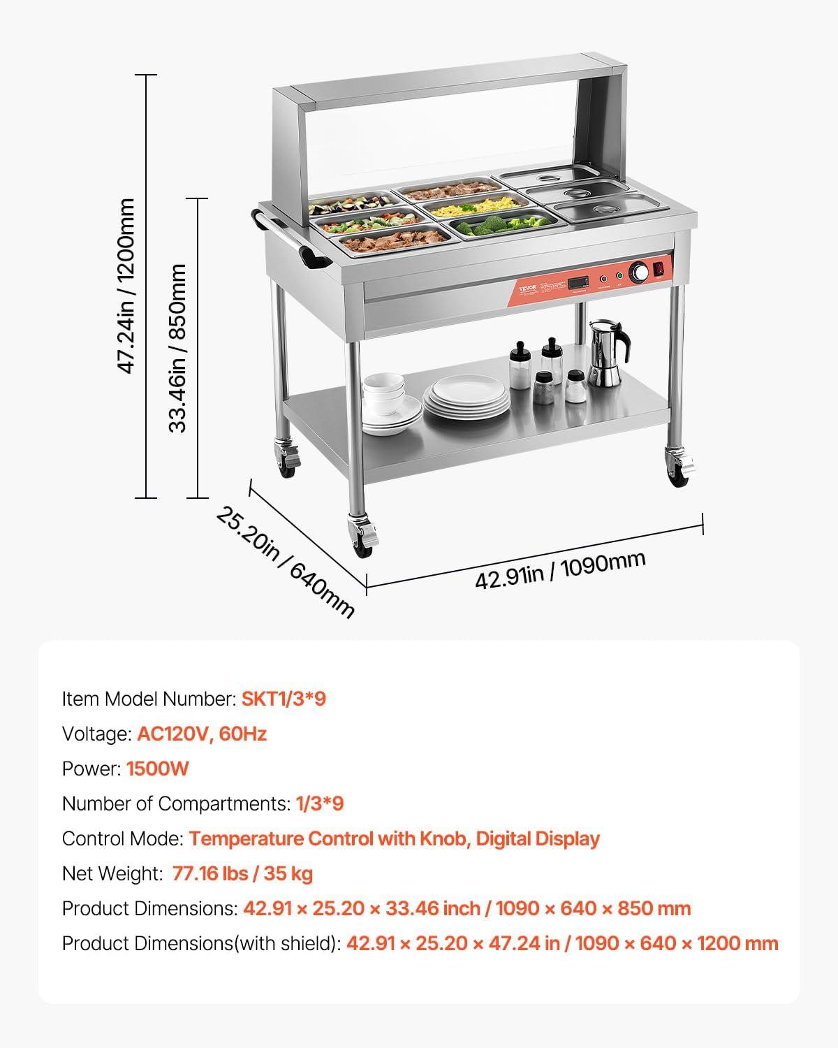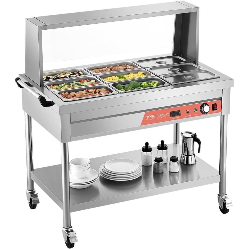VEVOR Commercial Electric Food Warmer, 7 Pans + 2 Pots Steam Table, 1800W Professional Buffet Catering Food Warmer with Shield Undershelf Wheels, Stainless Steel Server for Party Restaurant(8 Pans + 2 Pots)