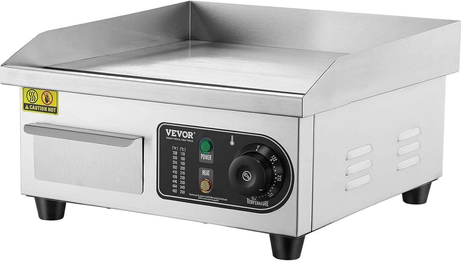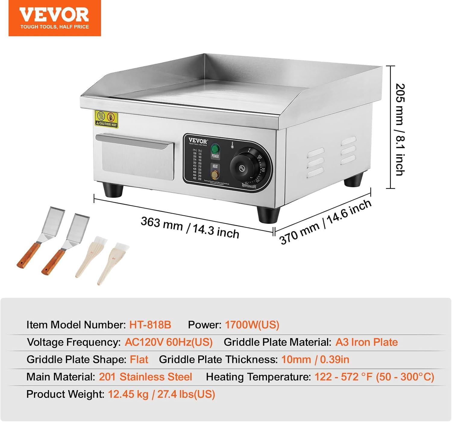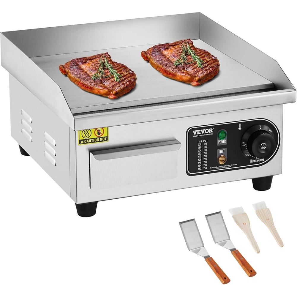 VEVOR Commercial Electric Griddle, 22″, 1600W Countertop Flat Top Griddle, Stainless Steel Teppanyaki Grill w/Iron Cooking Plate, 122-572℉ Adjustable Temp Control 2 Shovels & Brushes, 110V(14 inch)