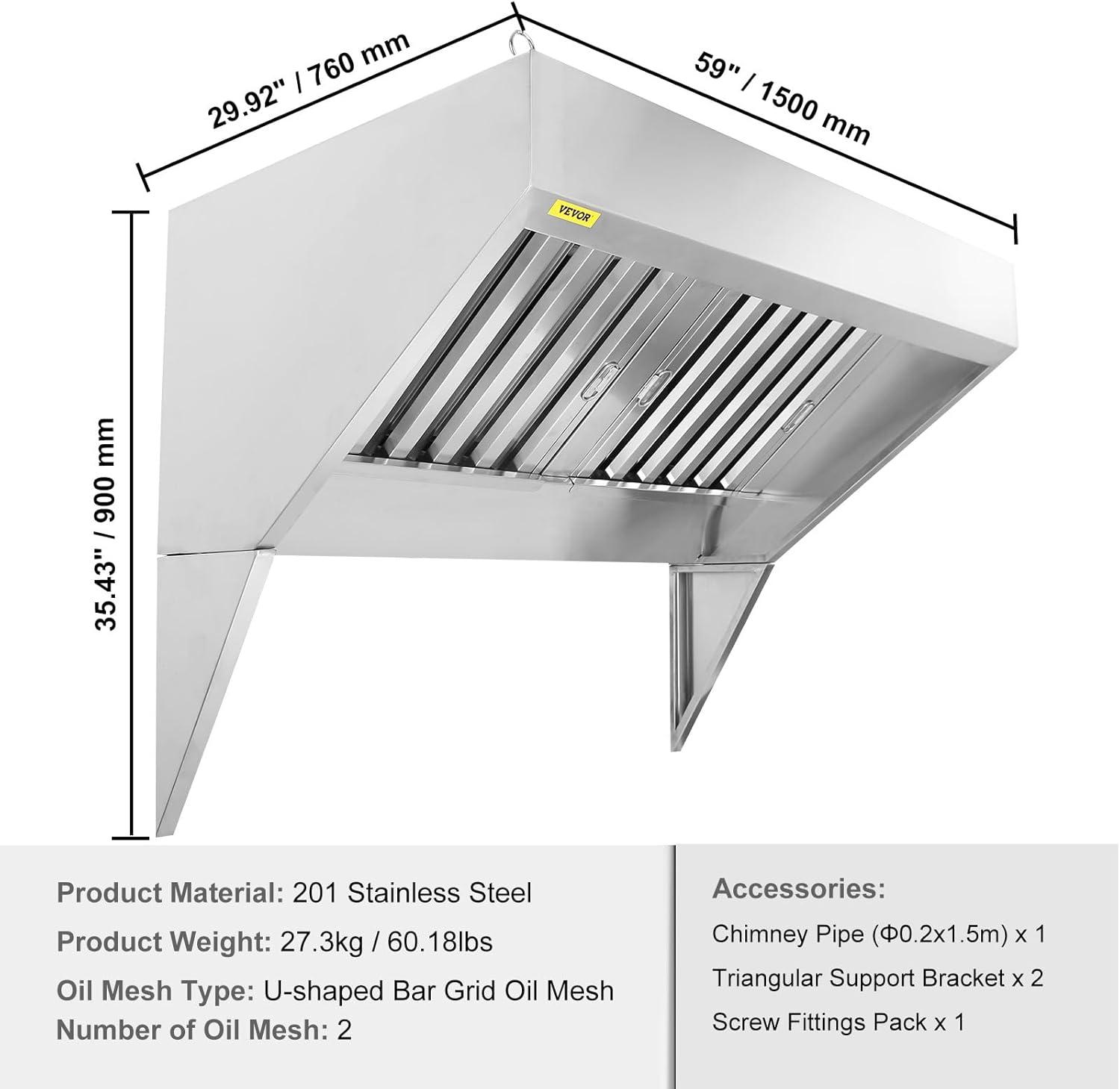 VEVOR Commercial Exhaust Hood, 6FT Food Truck Hood Exhaust, 201 Stainless Steel Concession Trailer Hood with 3 Detachable U-shaped Grid Oil Filter Mesh, Rust Resistant Vent Hood for Kitchen Restaurant(5FT)