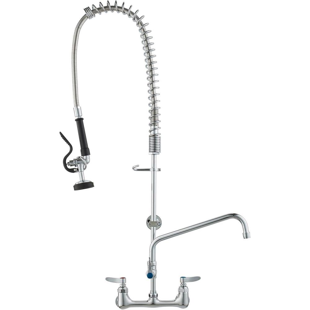 Wall-Mounted Commercial Faucet: This 21-inch tall pre-rinse faucet is designed for wall-mount installation in kitchen walls, featuring a spray head and a 12-inch swivel faucet, easily tackling complex and tough dirt challenges. It is suitable for use with 3-compartment professional-grade commercial kitchen sinks.