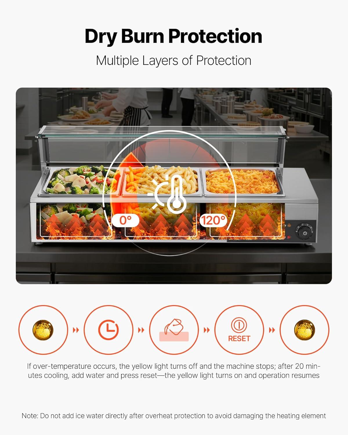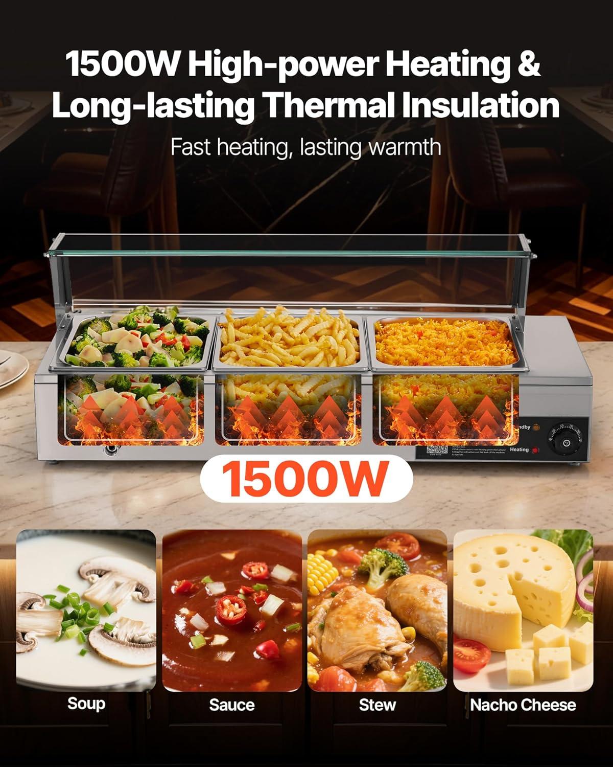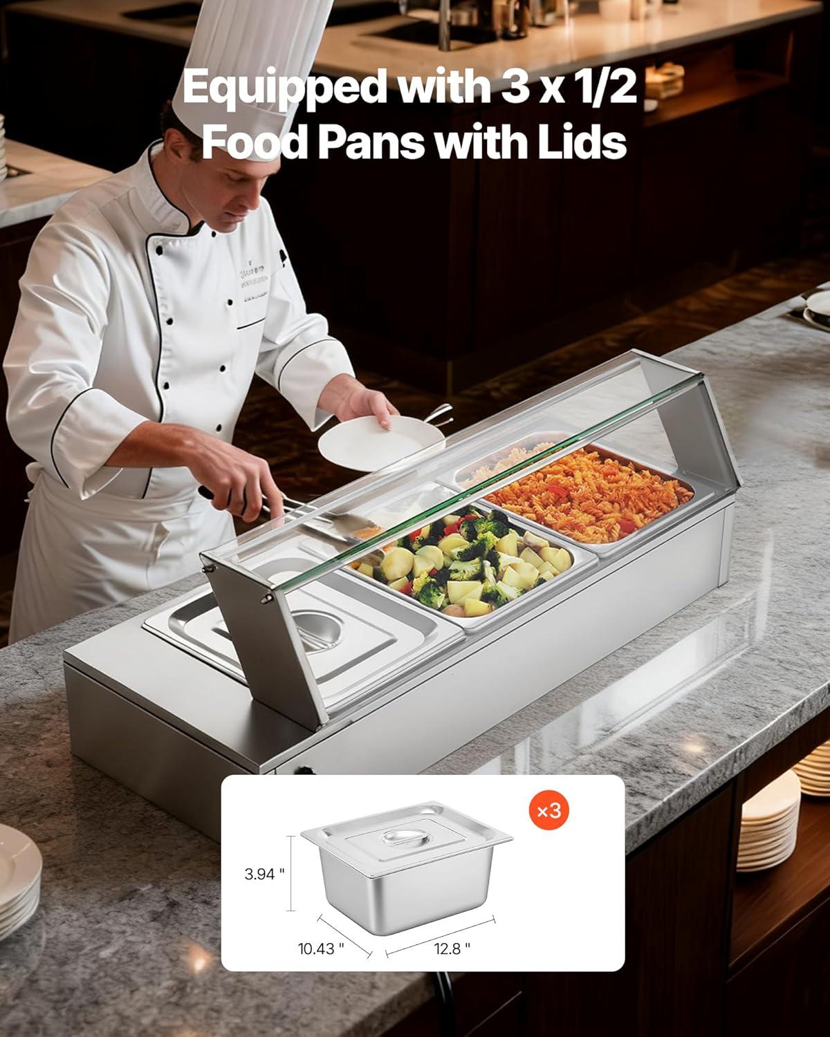 VEVOR Commercial Food Warmer, 1500W Electric Stainless Steel Steam Food Warmer, Fast Heating Countertop Buffet Bain Marie with Four 1/3 Size Food Pans, for Catering, Restaurants, Parties & Buffets(3*1/2Pan)