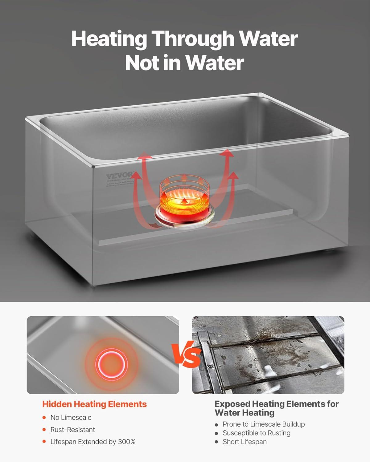 Large Space Design: With a 5.9 in standard depth, this buffet bain marie offers extra room for warming big batches of food. It easily handles family meals, parties, or events where you prepare dishes for many guests