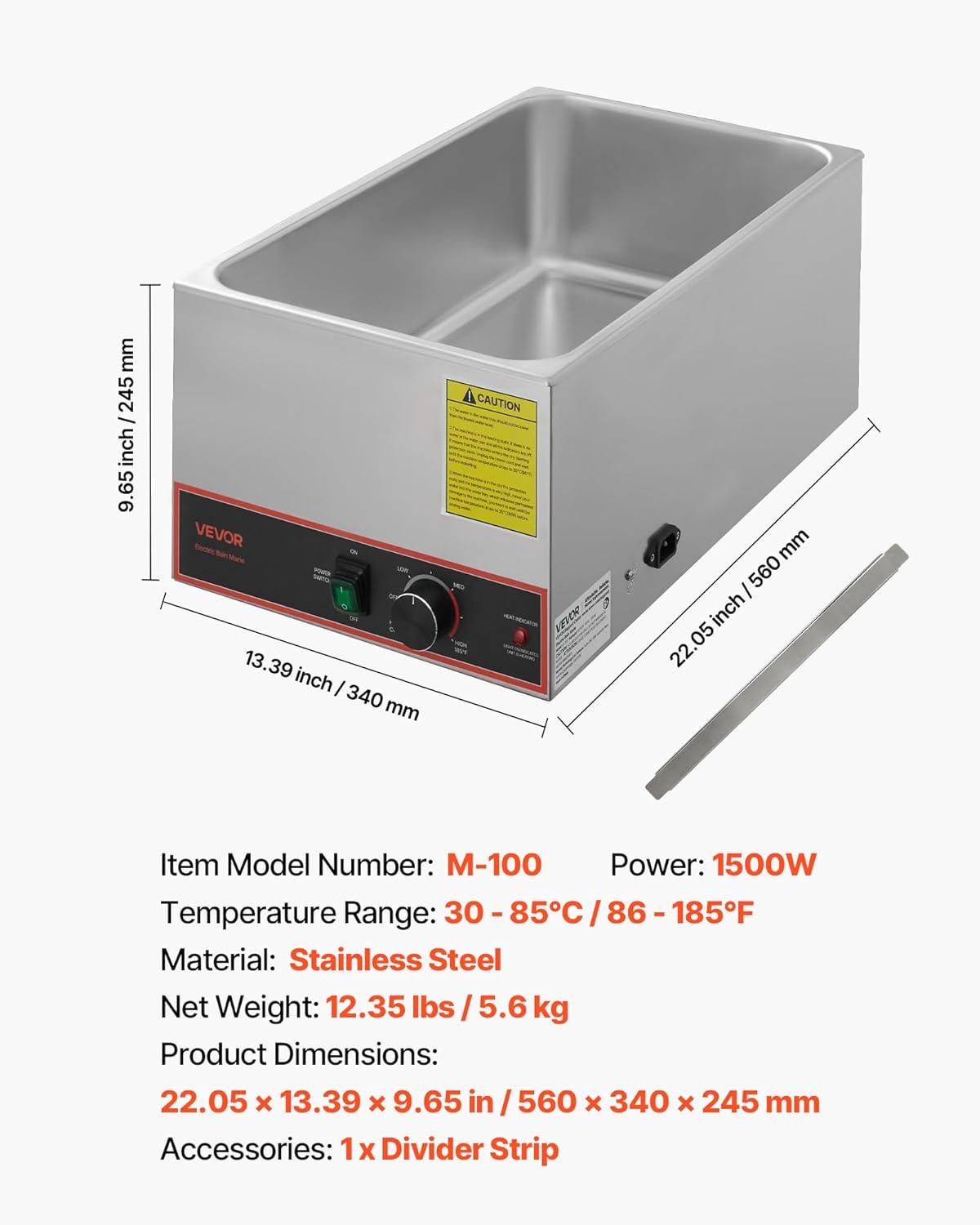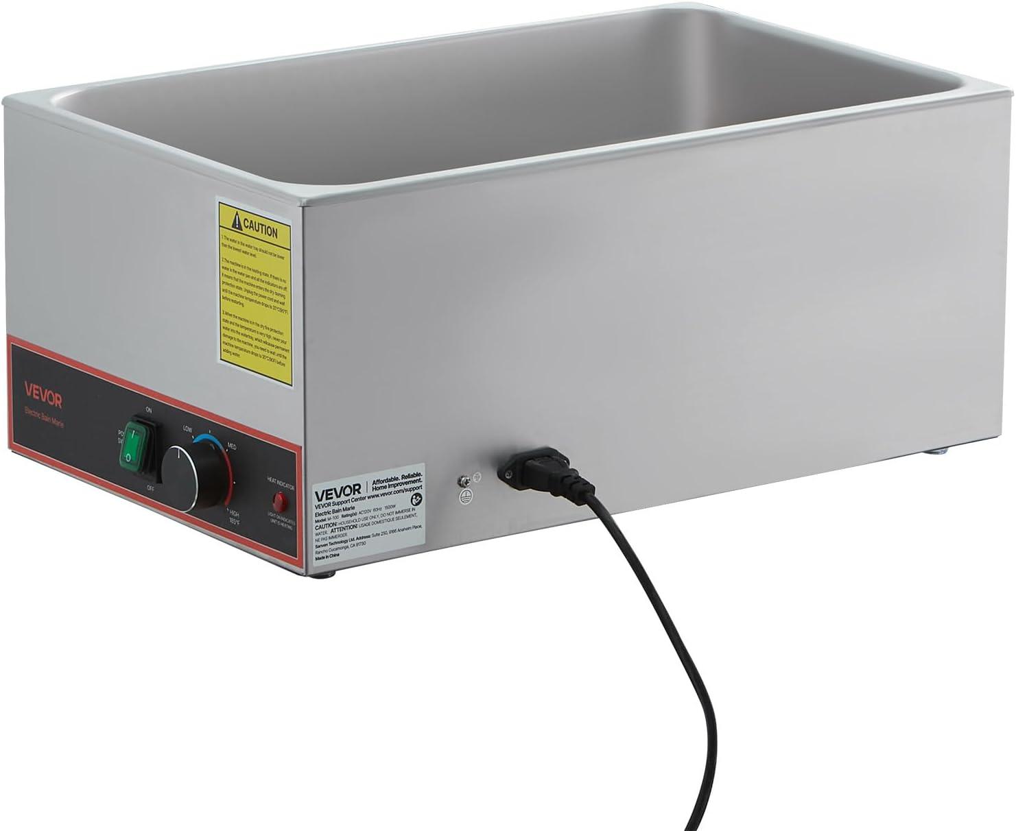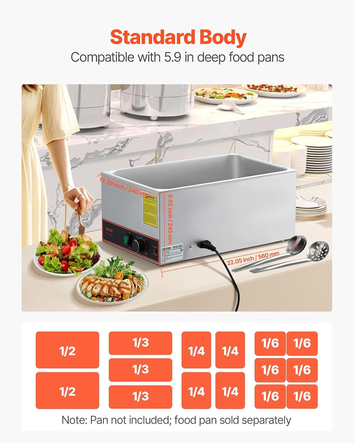 VEVOR Commercial Food Warmer, 1500W Electric Stainless Steel Steam Food Warmer, Fast Heating Countertop Buffet Bain Marie with Four 1/3 Size Food Pans, for Catering, Restaurants, Parties & Buffets(Full Size Pan)