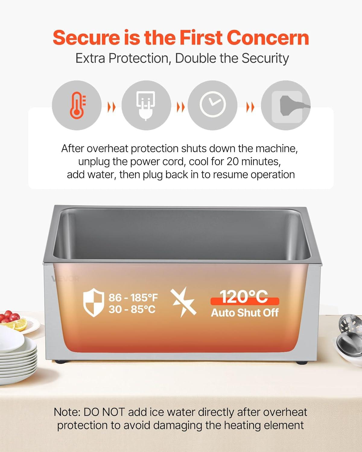 Fast Even Heating: Equipped with a strong 1500W stainless steel heating tube, this commercial food warmer heats food quickly to keep flavors fresh. You can set the temperature from 86–185°F (30-85°C), adjusting to suit various dishes and serving needs