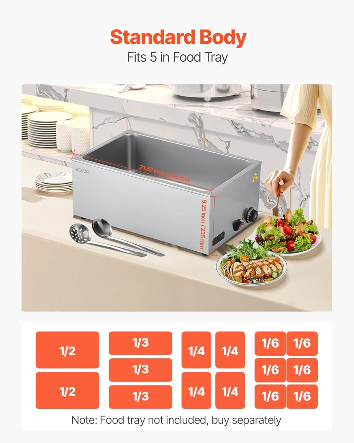 Large Space Combo: With a standard 5.9 in depth, this buffet bain marie comes with 6 x 1/3 size pans that fit all 5.9 in deep compartments. You can combine or swap them easily, creating menus from soups and sauces to stews, nacho cheese, or chocolate
