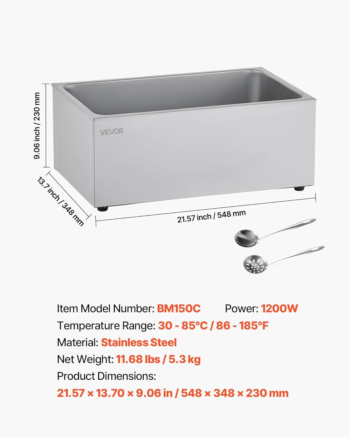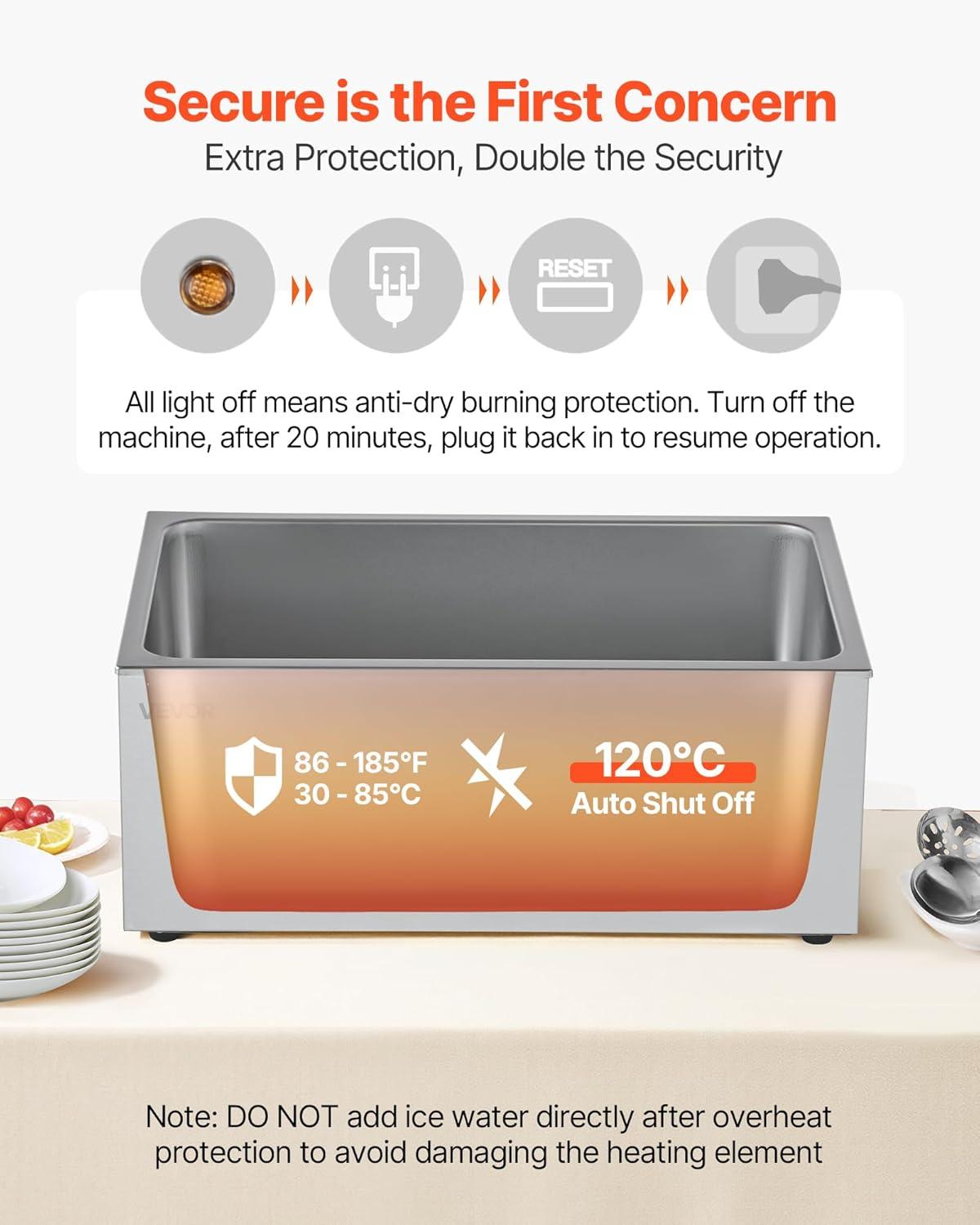 Fast Even Heating: Equipped with a strong 1500W stainless steel heating tube, this commercial food warmer heats food quickly to keep flavors fresh. You can set the temperature from 86–185°F (30-85°C), adjusting to suit various dishes and serving needs