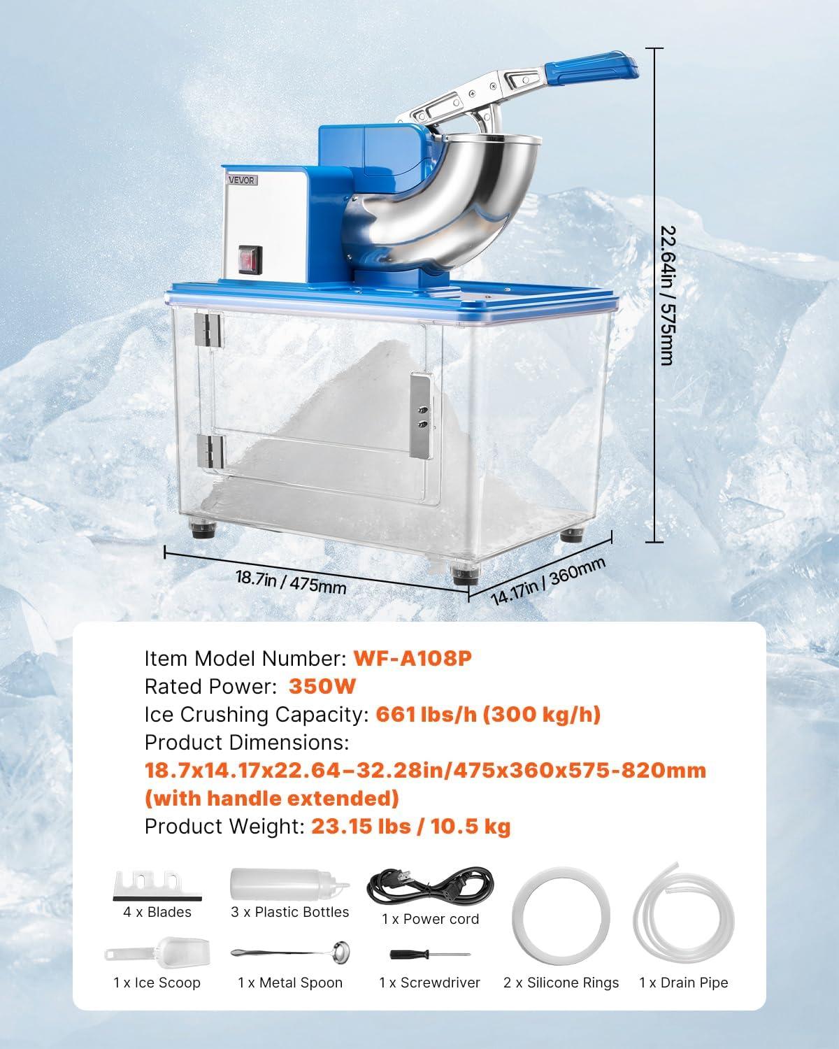 Our clearance section features the best deals on VEVOR Commercial Ice Crusher 661LBS/H, 350W Electric Snow Cone Machine with 4 Blades, 2000RPM Stainless Steel Shaved Ice Machine with 11 Gal Crushed-Ice Box, for Family Restaurants Bars, Blue(Blue) and accessories. Check it out now!