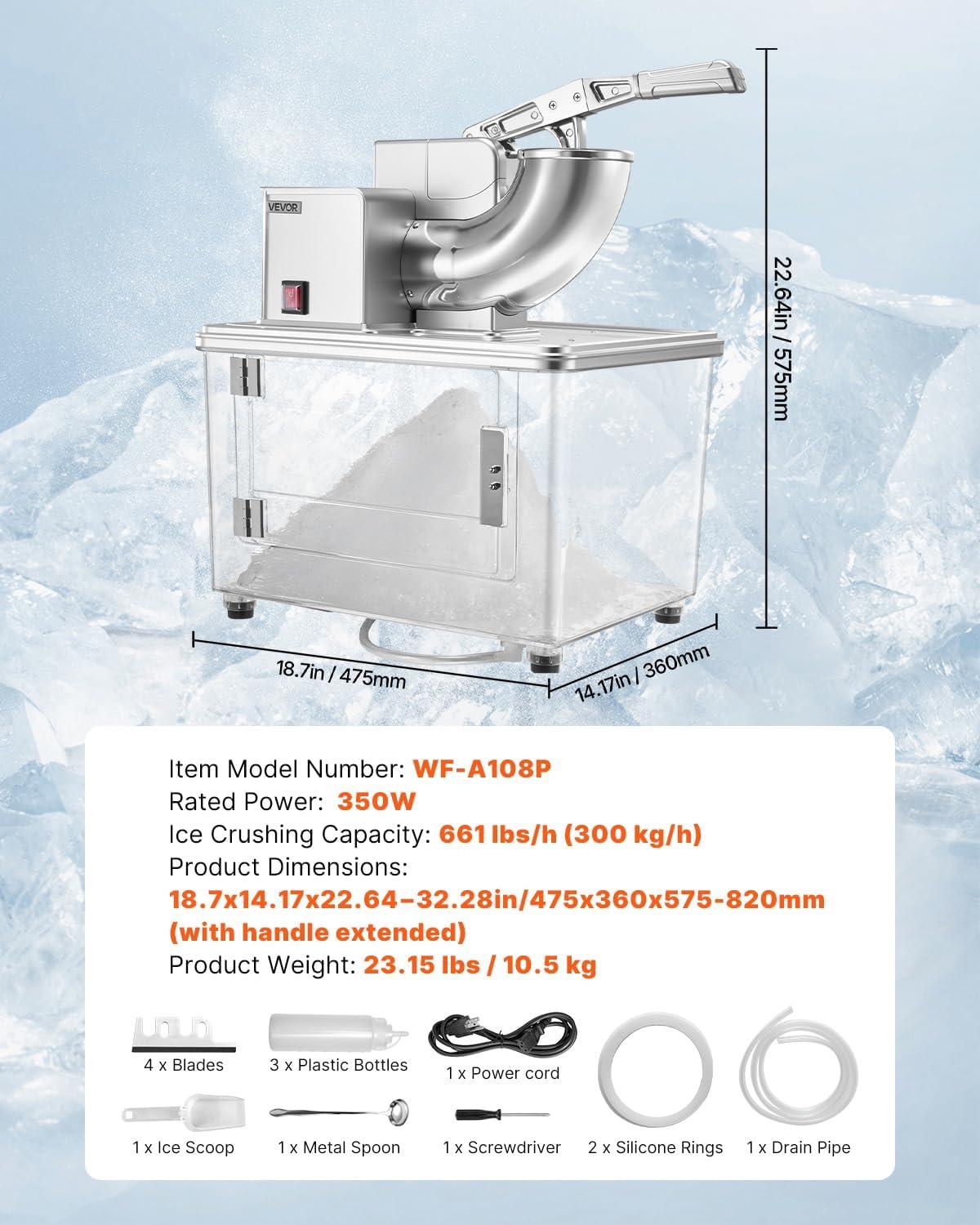 High-Efficiency Ice Crushing: With a 350W motor and 2000 RPM, this ice crusher uses premium 4 stainless steel blades, achieving 661 lbs/h crushing capacity. It quickly turns ice cubes into fine snow, meeting all your ice-crushing needs