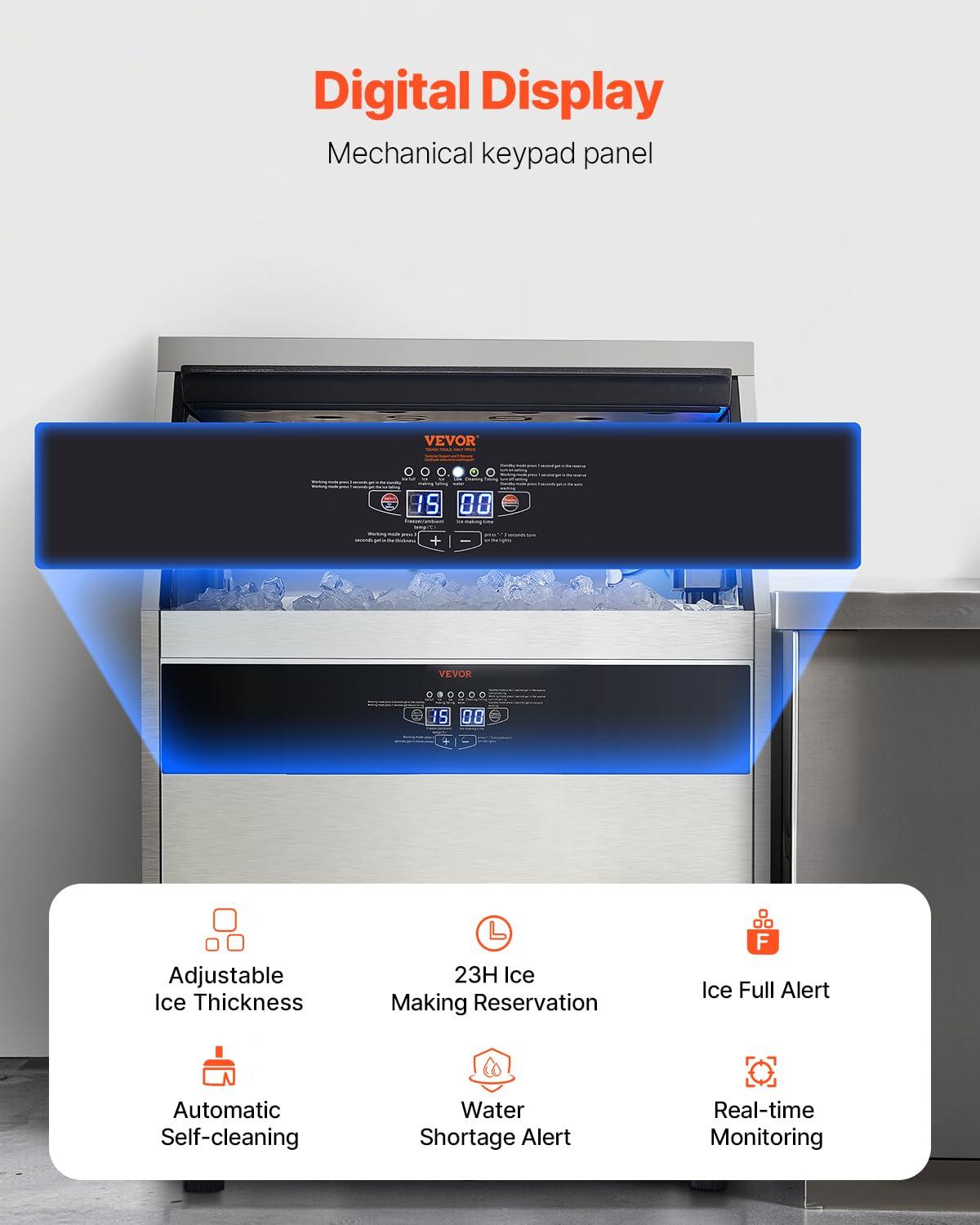 Smart Control Panel: Our commercial ice maker features an LED digital display and mechanical buttons, giving you precise control over the ice-making process. Adjust ice thickness by increasing or decreasing ice-making time effortlessly. You can monitor the status of the ice maker in real-time with the indicator light on the panel