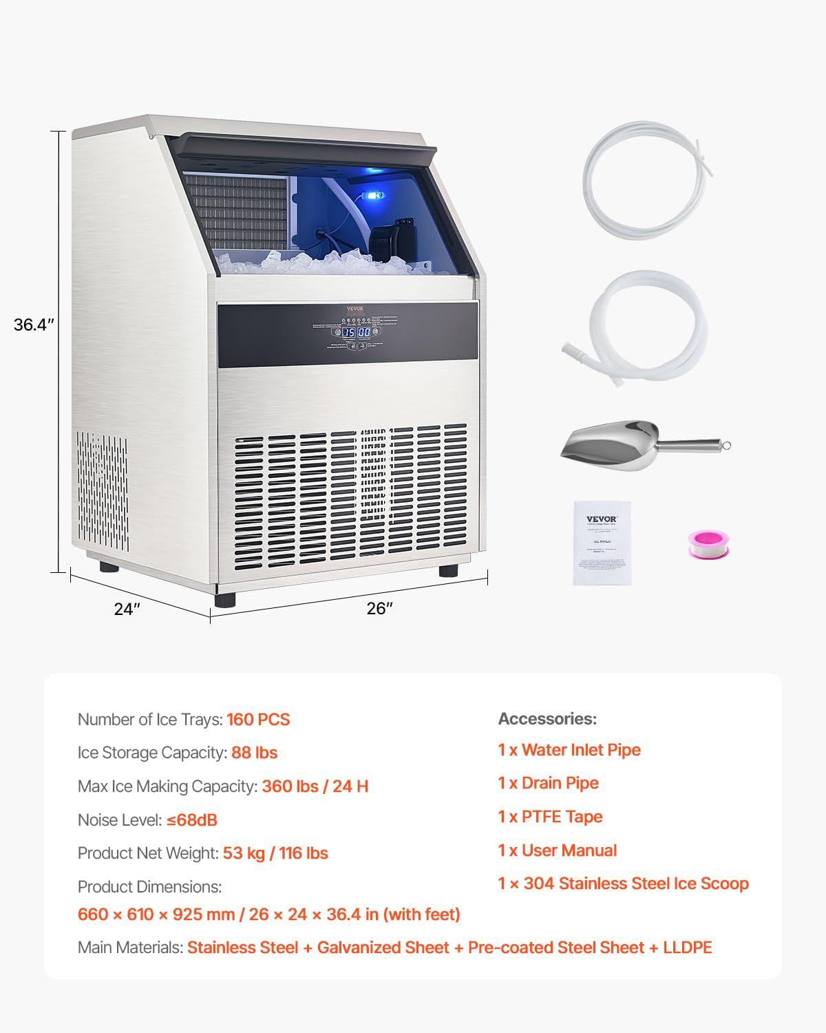 Commercial Ice Maker: Our commercial ice maker machine is designed with 36 pcs ice trays and can produce up to 100 lbs of ice cubes per day (test conditions: 50-100.4℉/10-38℃ ambient temperature). This compact ice maker has a generous storage capacity of 28 lbs and fits perfectly in your home, coffee shop, bar, restaurant,and more
