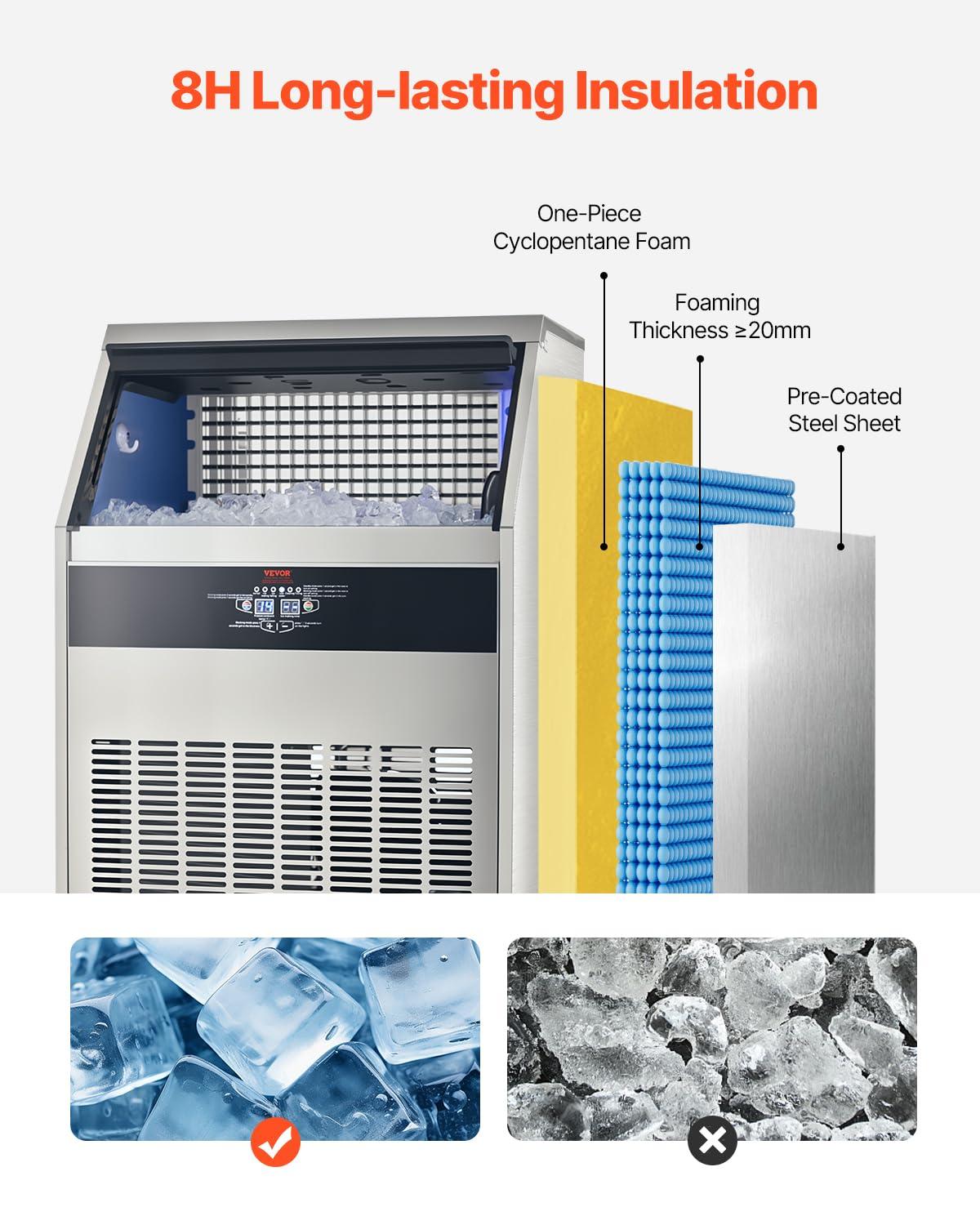 8H Insulation: Our commercial ice maker takes insulation to a whole new level. It features a thickness ≥20mm cyclopentane insulation material and a quality shell for effectively isolating external heat. Even when the machine takes a break, your ice cubes stay frosty for a remarkable 6-8 hours