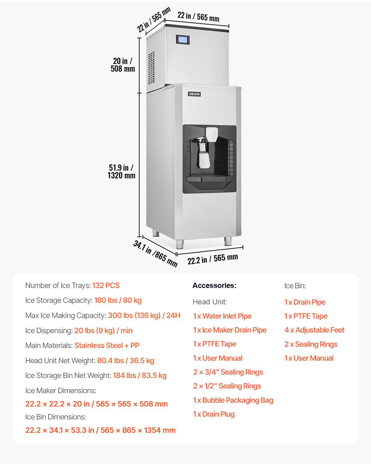 Ice Dispenser: The 180 lbs capacity ice storage bin features an automatic ice dispensing function and can dispense 20 lbs of ice cubes every minute