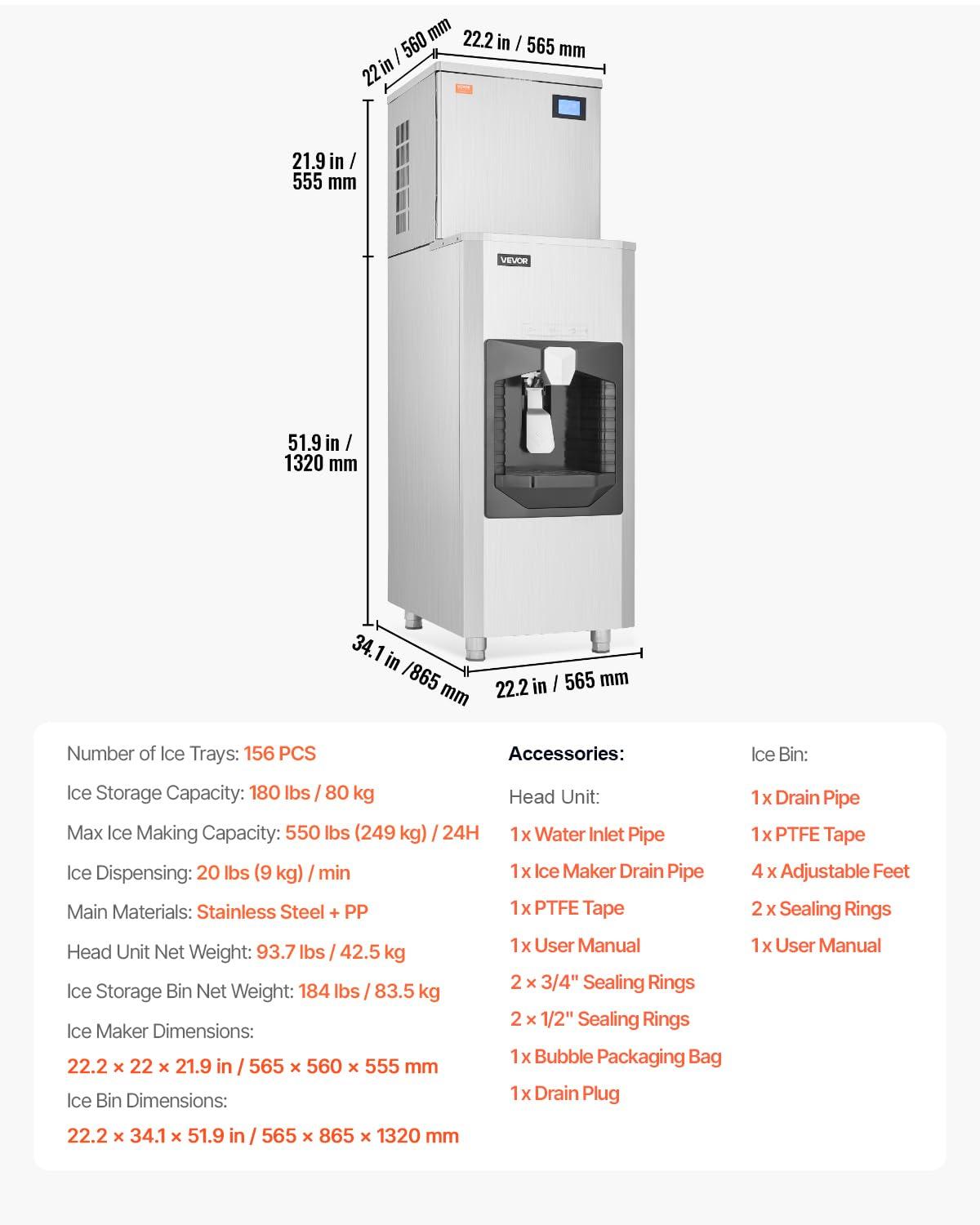 VEVOR Commercial Ice Maker, 450 Lbs/Day Ice-Making Machine, 180 Lbs Large Storage Bin with 20 Lbs/Min Automatic Ice-Dispensing, Self-Cleaning Ice Machine with Touchscreen for Bar, Cafe, Restaurant(550LBS/24H)