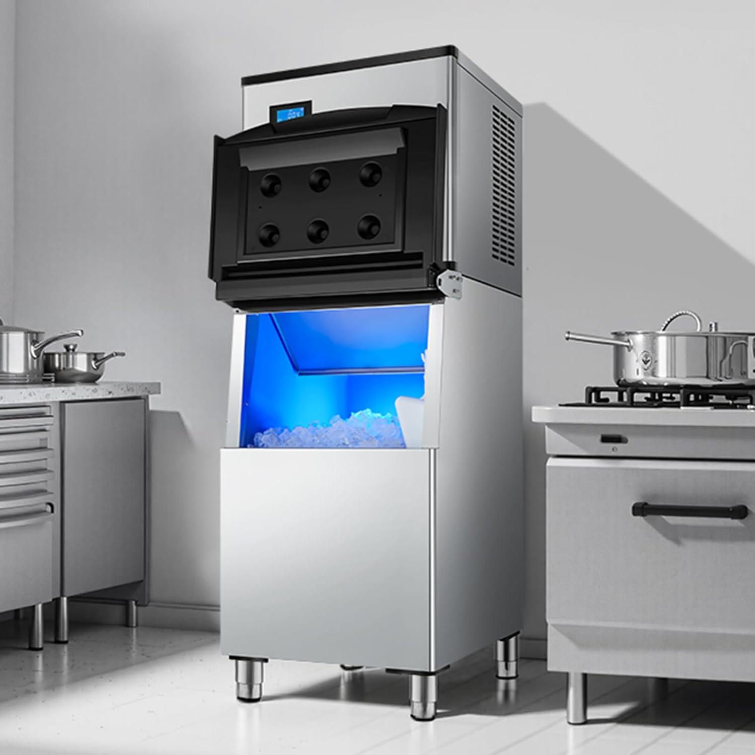 Additional Features: The ice storage bin features a buffer door design to avoid injuries and reduce noise and vibration. It provides a large ice output, making it ideal for commercial kitchens, restaurants, bars, hotels, and beverage shops