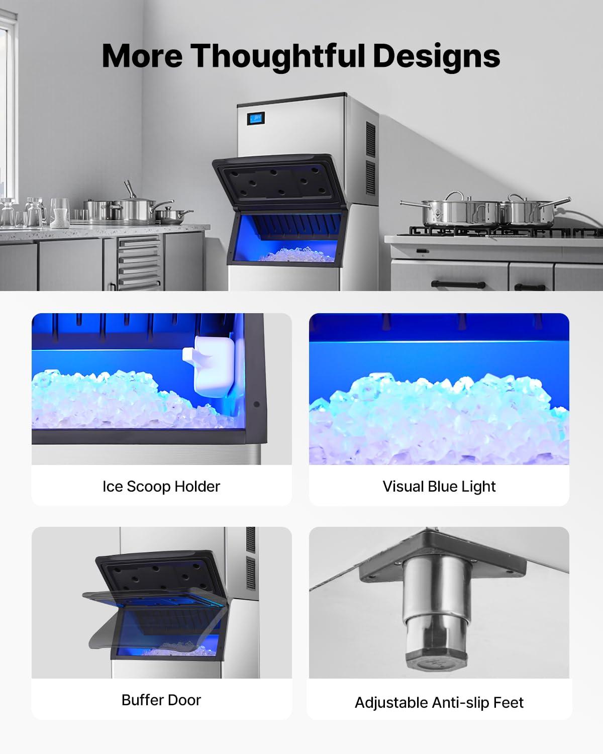 Additional Features: The ice storage bin features a buffer door design to avoid injuries and reduce noise and vibration. It provides a large ice output, making it ideal for commercial kitchens, restaurants, bars, hotels, and beverage shops