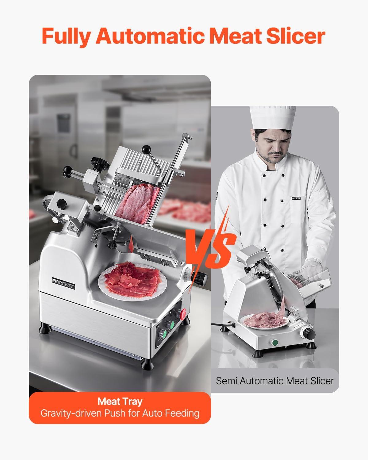 VEVOR Commercial Meat Slicer, 10 inch Electric Food Slicer, 240W Frozen Meat Deli Slicer, Premium Chromium-plated Steel Blade Semi-Auto Meat Slicer For Commercial and Home use(12IN-180W + 370W)