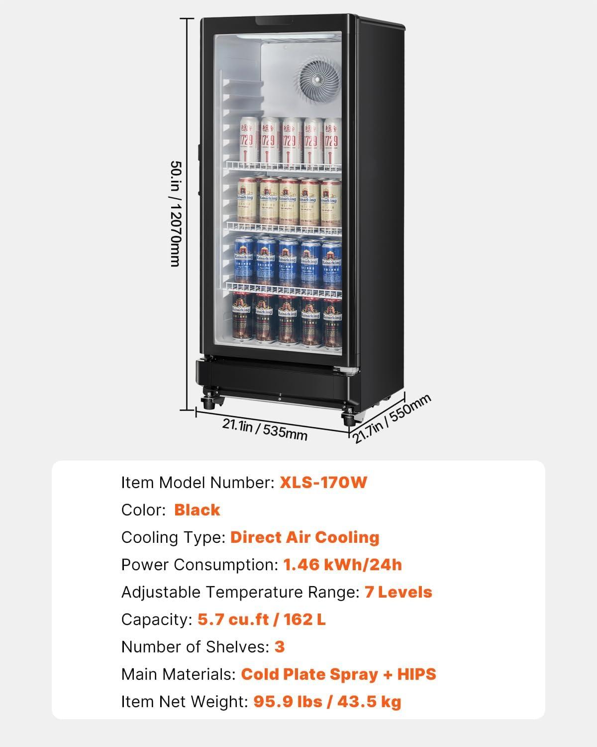 VEVOR Commercial Merchandiser Refrigerator, 11.47 CU.FT Glass Door Display Refrigerator, Upright Beverage Refrigerator Cooler Merchandiser with 4 Adjustable Shelves, Casters, Soft LED Light, Black(5.7 cu.ft)