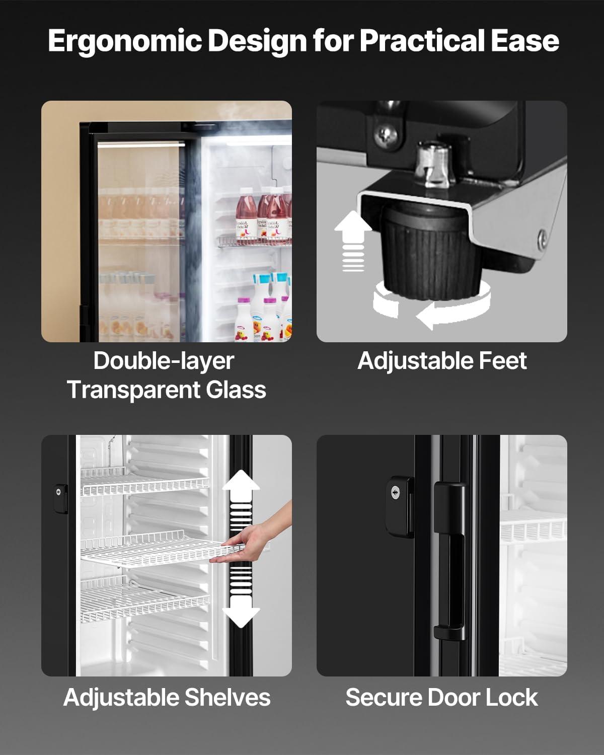 Exceptional Display Performance: Our commercial merchandiser refrigerator delivers double-layer high-transparency glass that keeps out external heat while letting you see the inside without opening the door. Plus, the LED lighting with an independent switch creates an eye-catching lighting experience, showcasing your beverages beautifully. Note: Please let the unit rest for at least 6 hours and then power on after receiving it