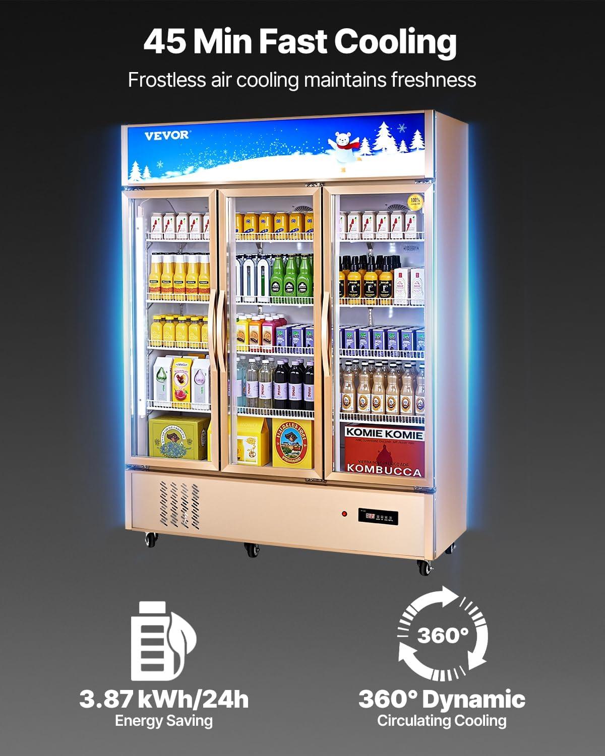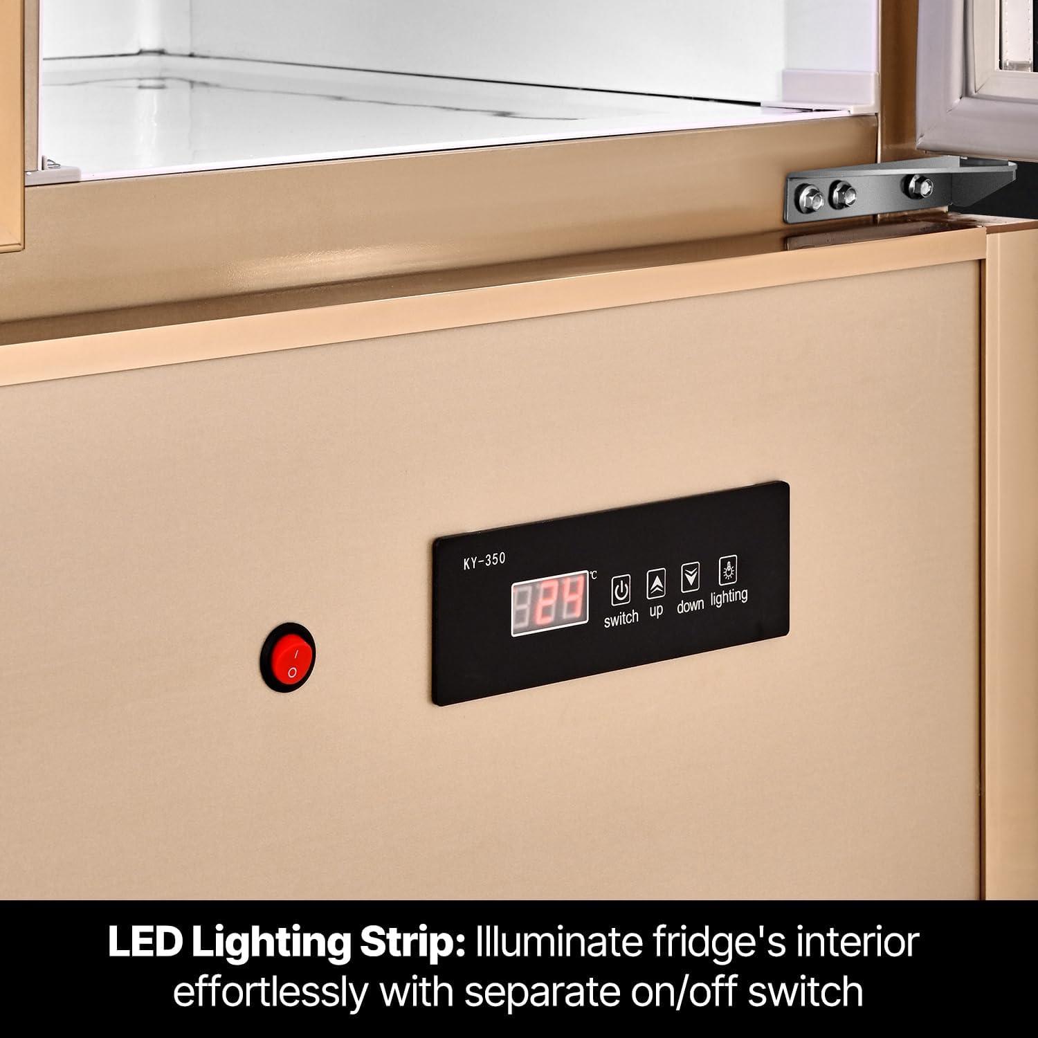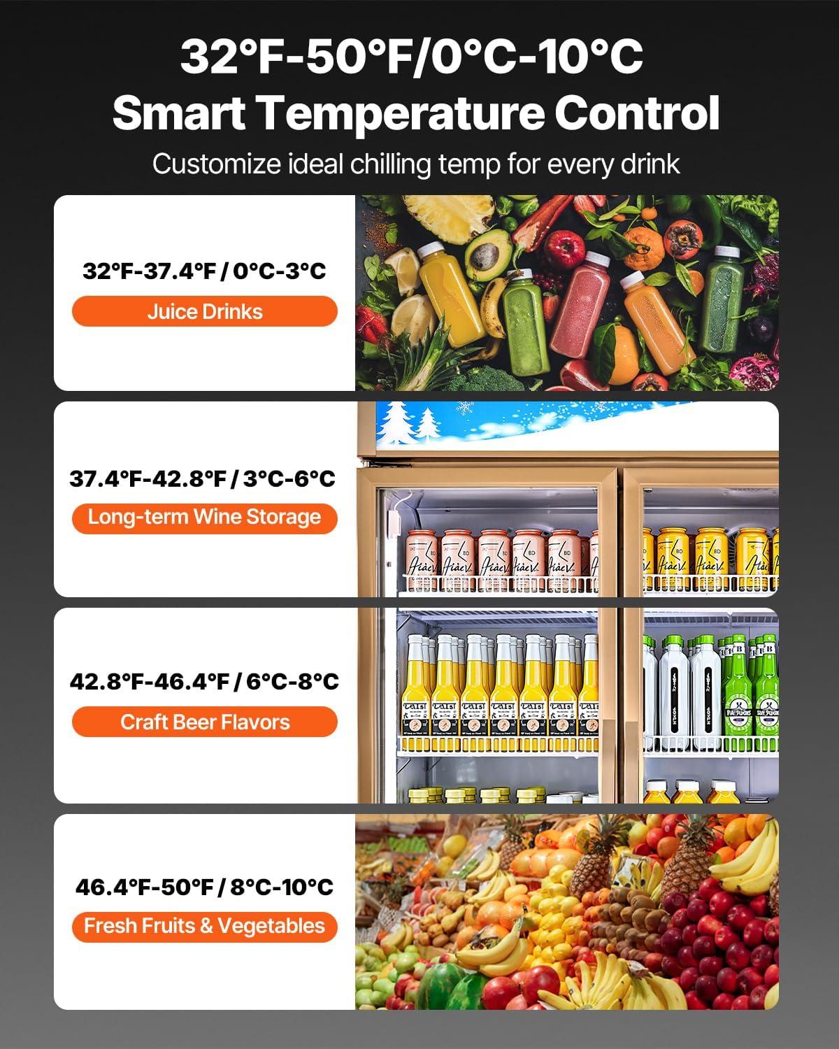 Stays Cool: Temperature range: 0-10℃/32-50℉. The temperature can be precisely adjusted by the digital display. You can observe and control the temperature inside the refrigerator at any time. Copper cold pipe and R290 environment-friendly refrigerant are used inside to ensure optimal coldness without freezing liquids. Our 205W heavy-duty glass door refrigerator features energy-efficient advanced technology and a whisper-quiet compressor.