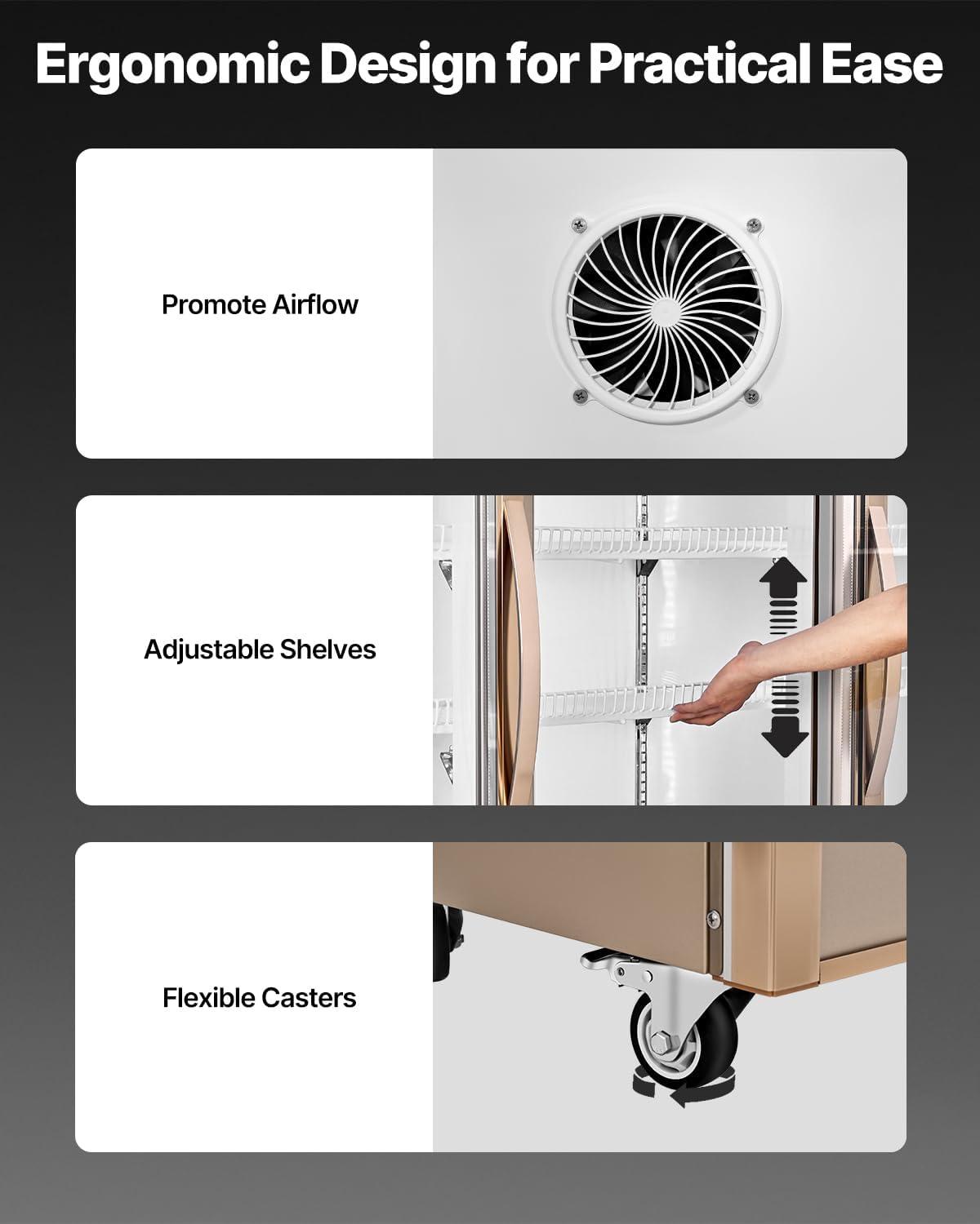 Advanced Features And Design: The efficient airflow system helps to keep foods and drinks fresher. The LED interior light illuminates for an easy nighttime selection of your drink. This refrigerator with 5 casters lets you move and place your freezer freely. The door handle makes getting your favorite beverages effortless. The poster on the top can be replaced with your customized poster. Just open the plastic board then replace it to showcase your business name or the name of your home bar.