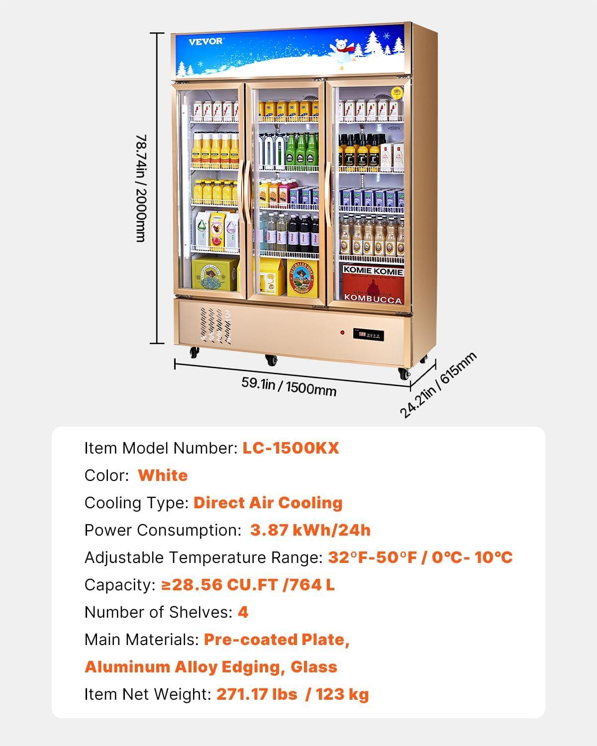 Plenty of Storage Space: Volume: 35 Cubic ft/ 895 L. Item Dimension: 59.1 x 26.8 x 78.7 inch. 12 shelves in total, 44 lbs loading capacity per shelf. It also features adjustable and removable shelves. This commercial cooler can conveniently store up to 360 standard-sized beer cans!