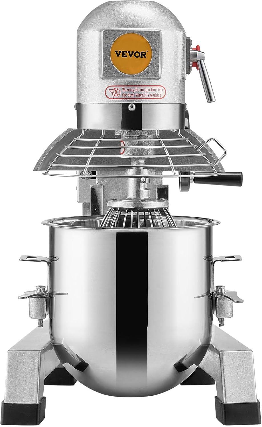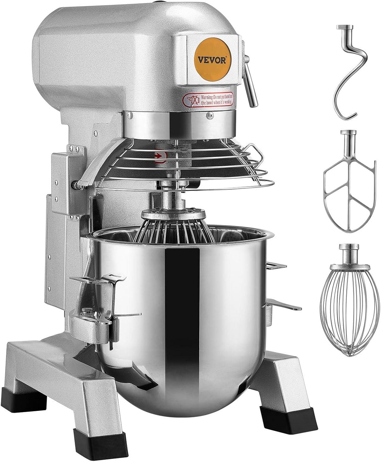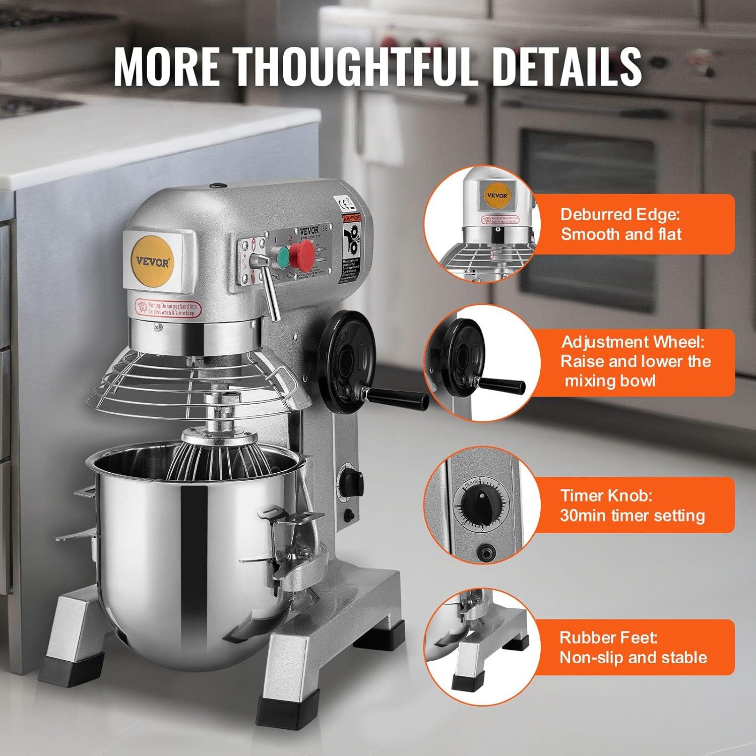 Versatile Machine: Our commercial stand mixer is equipped with 3 stirrers, including a dough hook, a flat beater, and a wire whip. The dough hook is used for smoother mixer operation and is ideal for pizza and other heavy dough. The flat beater is suitable for mashing potatoes or vegetables, mixing cakes, batters, or icing. The wire whip is widely applied in aerating light mixes such as whipped cream, egg white. These considerate accessories help you achieve the results you need for any recipe.