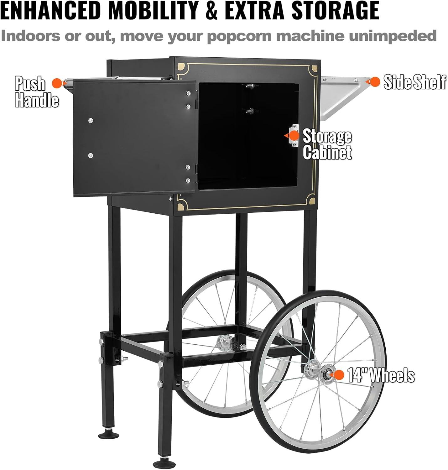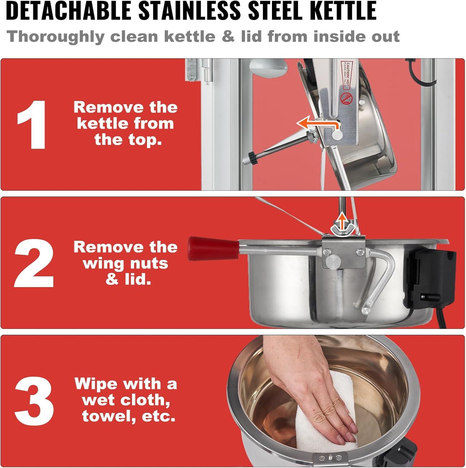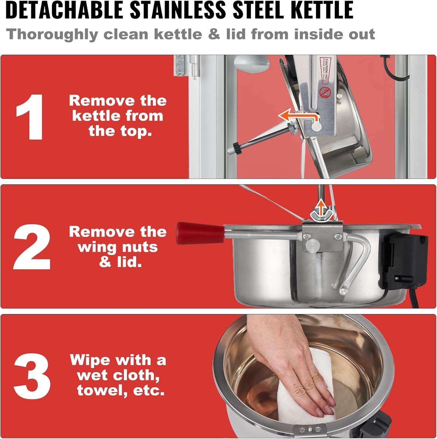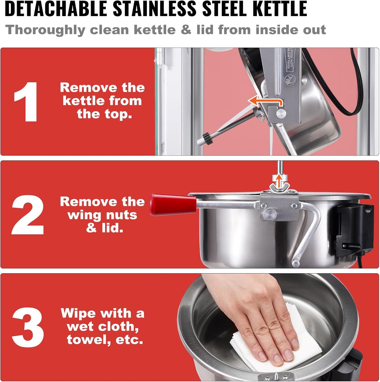 Durable Structure, Effortless Cleaning: This countertop popcorn machine comprises a cold rolled steel frame and tempered glass panels to withstand frequent use. The doors with magnetic latch provides quick access and enhances the appearance of the popcorn inside. The printed graphics on its top may also catch some hungry stares. Besides, the wing nuts on the kettle allow you to detach its lid easily and clean its interior thoroughly. Hassle-free cleaning will extend the machine's service life.