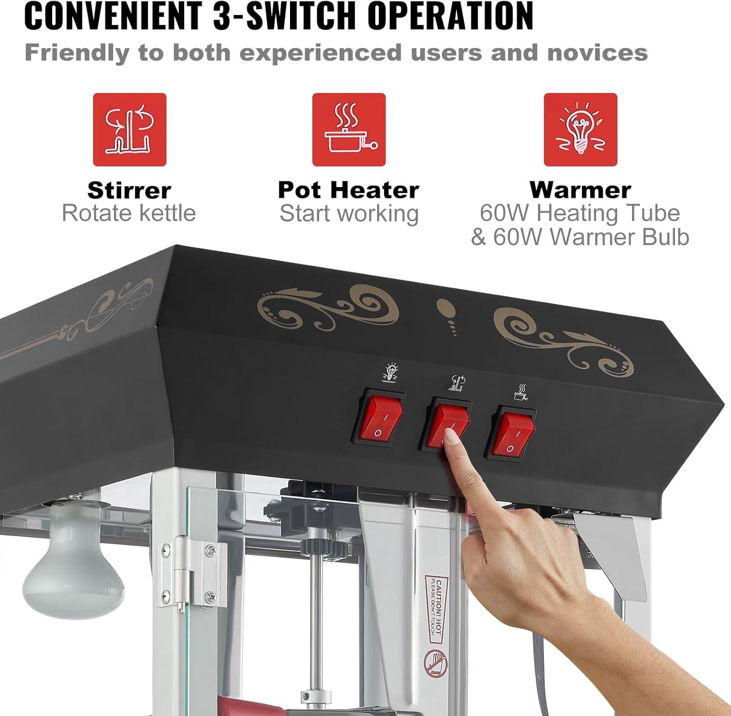 Simple Operation, Lasting Warm: 3 fantastic switches control the whole unit: Warmer, Stirrer, and Pot Heater. Simplified control streamlines the operation, making it easy for any staff member to use. The warming deck features a 60W heating tube underneath. Once the popcorn machine begins cooking, finished popcorn will fall to the warming deck and stay fresh until you're ready to serve. Besides, the 60W warmer light brightly illuminates your popcorn. Let them shine and catch the eyes of everyone!