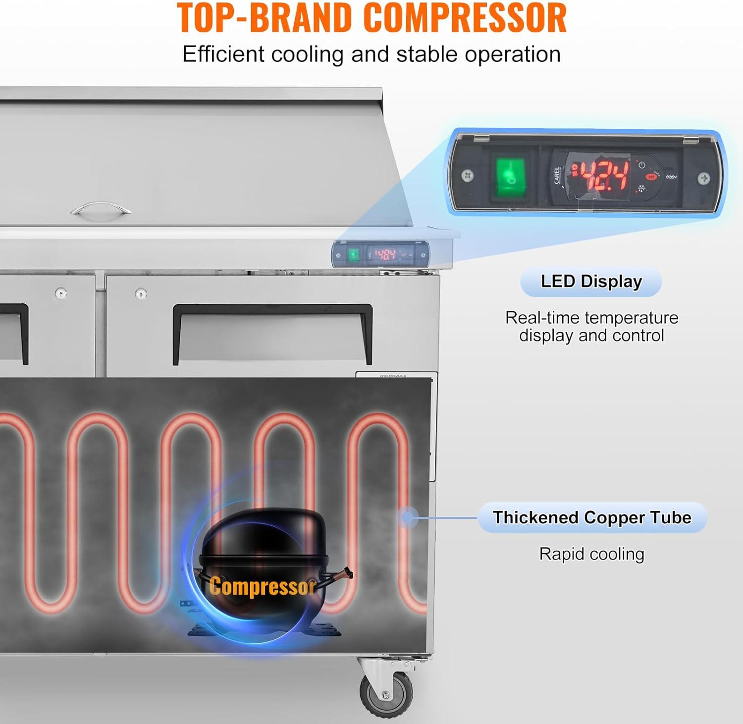 Security Protection: Our food prep fridge is built-in overload protection that automatically shuts down the machine during abnormal use. The innovative insulated button design reduces the risk of electric shock while being user-friendly and accessible.