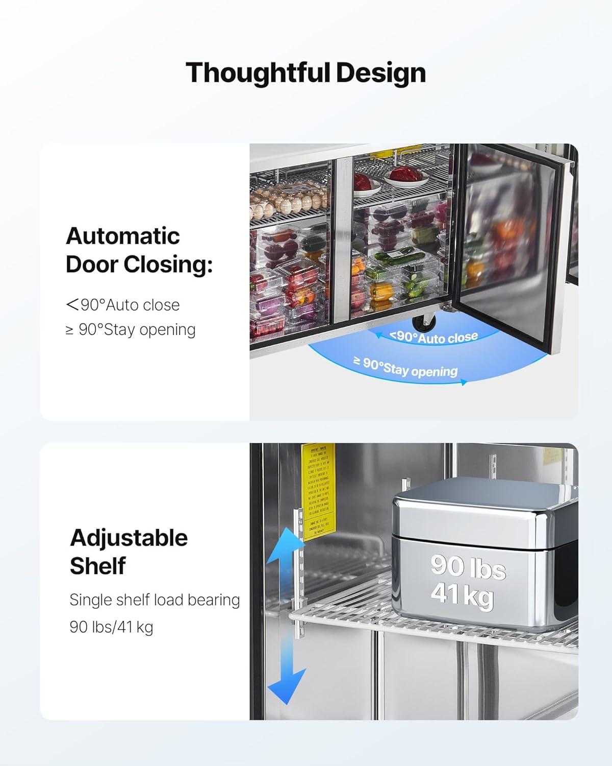 Security Protection: Our food prep fridge is built-in overload protection that automatically shuts down the machine during abnormal use. The innovative insulated button design reduces the risk of electric shock while being user-friendly and accessible.